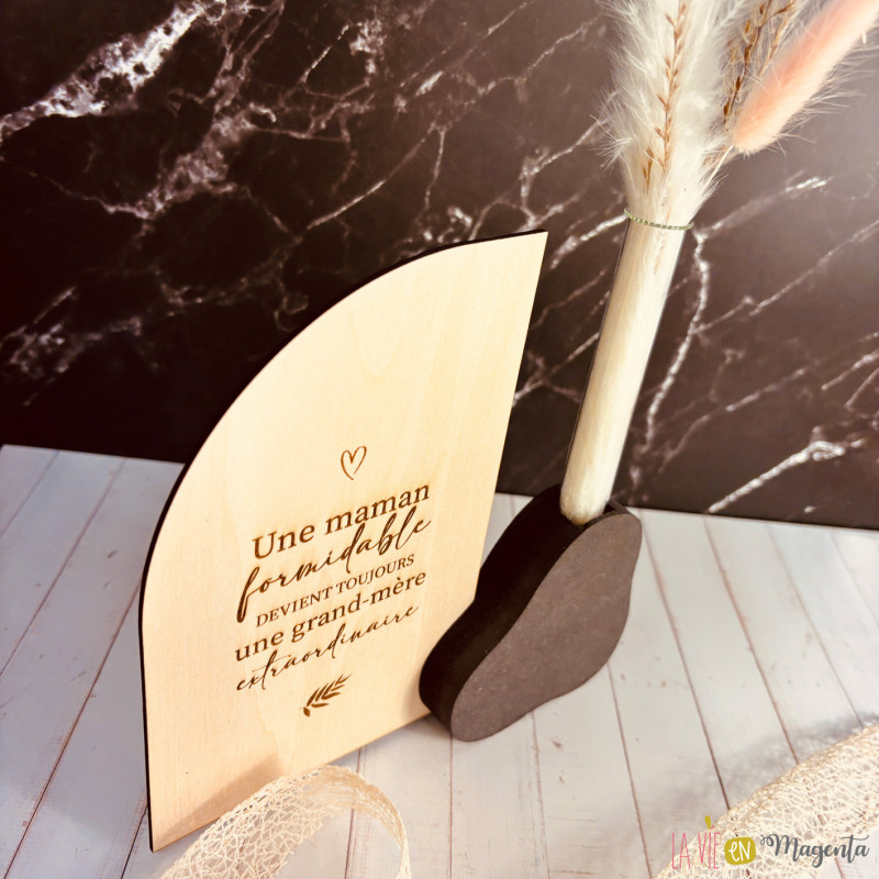 Design élégant : Une pancarte en bois gravée au laser, ornée d’un texte touchant.