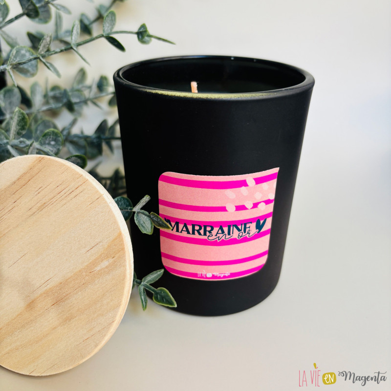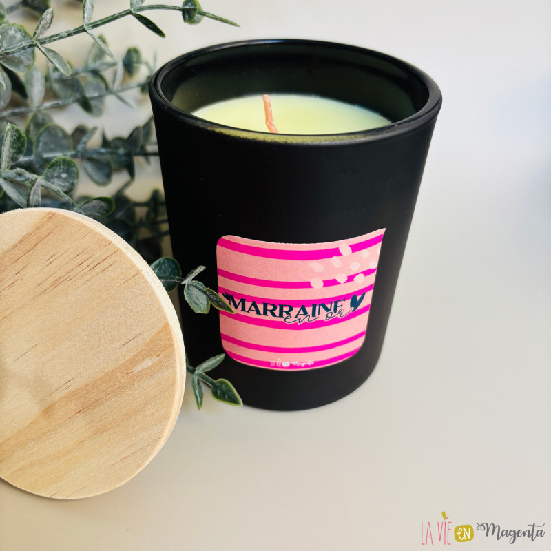 Bougie parfumée dans un joli contenant en verre noir mat avec couvercle en bois. Message pour une marraine. Un cadeau élégant et plein de peps, parfait pour toutes les occasions. Collection disponible avec différents messages et en version diffuseur à bâtonnets.