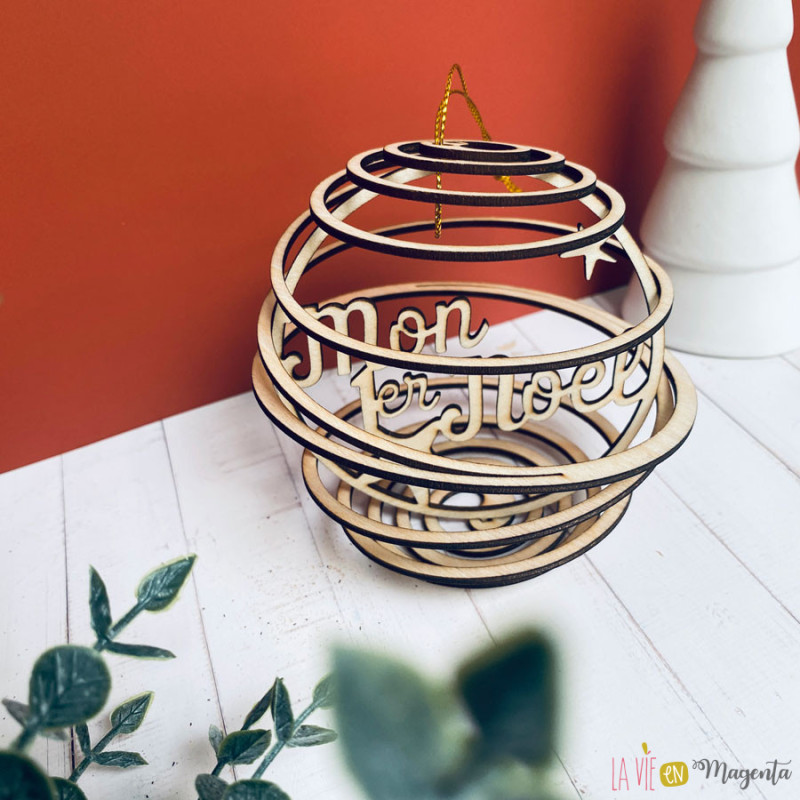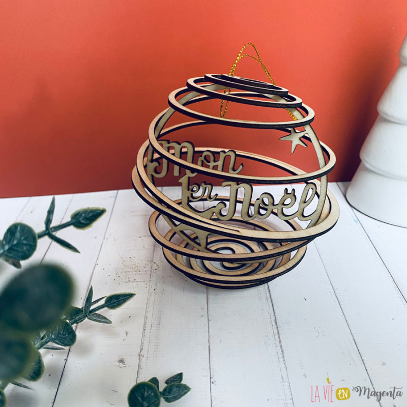 Cette boule de Noël en bois naturel est découpée au laser avec un design spirale ajouré, et gravée du message “Mon 1er Noël”. Elle allie élégance, artisanat et émotion, apportant une touche chaleureuse et symbolique au sapin des jeunes parents.