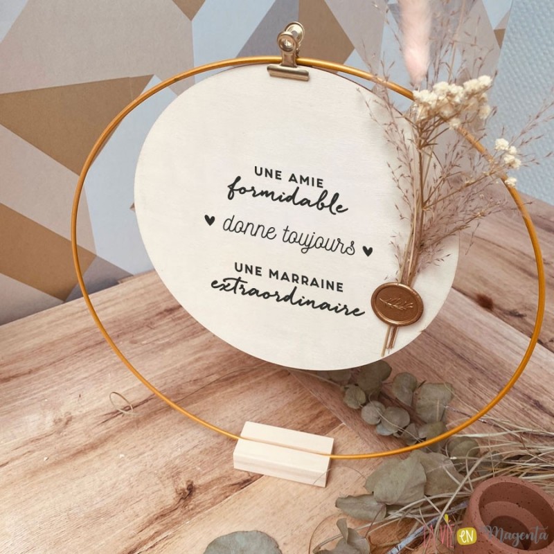 Magnifique cadeau pour marraine, jolie plaquette en bois imprimée avec demande pour une marraine, avec petit bouquet de fleurs sechées, encadrée par son élipse dorée sur support en bois.