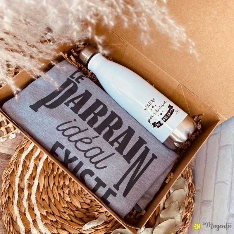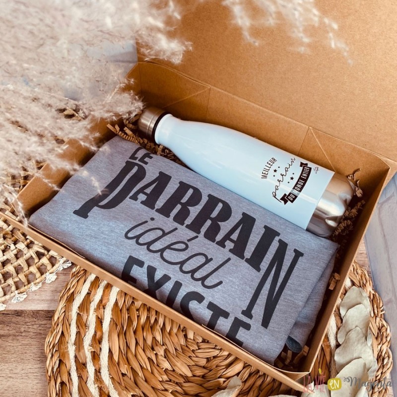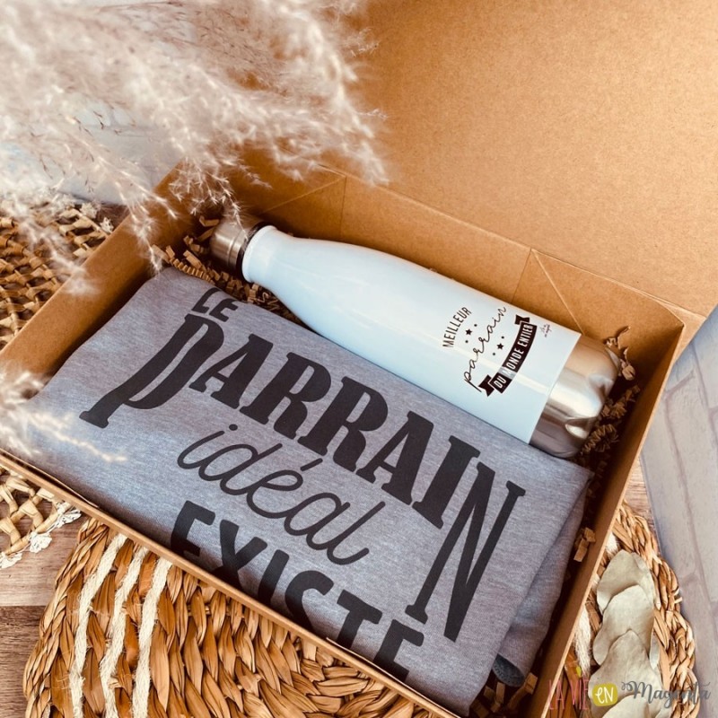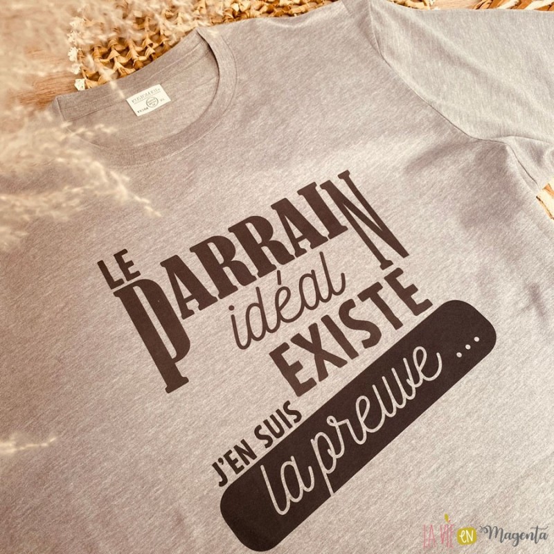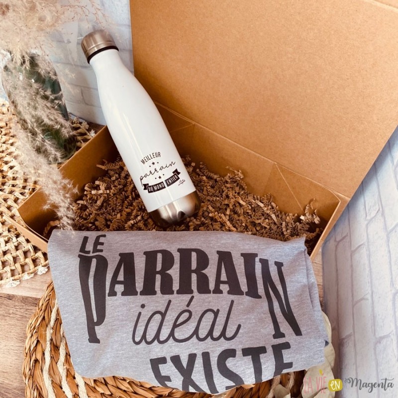 - t-shirt comportant la mention 'le parrain idéal existe, j'en suis la preuve' (merci d'indiquer en commentaire de votre commande la taille souhaitée pour le tshirt)