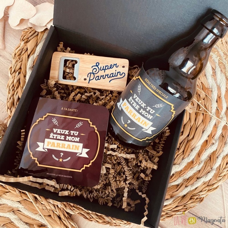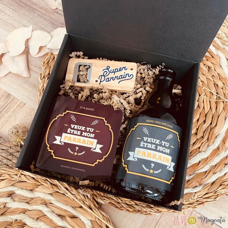 Joli coffret cadeau noir pour une demande parrain, composé de :
