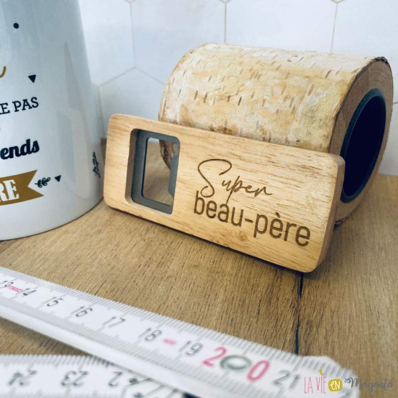 Coffret cadeau pour super beau-père comprenant un mug avec le message « Beau-papa, tu ne m’as peut-être pas donné la vie mais tu me la rends meilleure », un mètre gravé, un porte-clé et un décapsuleur. Une idée cadeau originale et pleine d’émotion, parfaite pour la fête des pères, un anniversaire ou toute autre occasion.