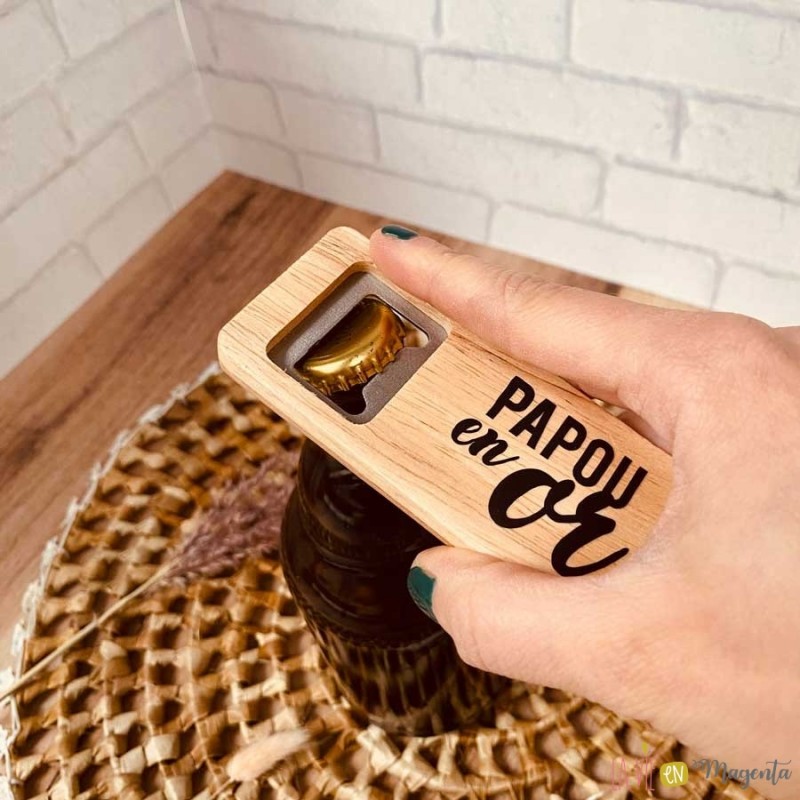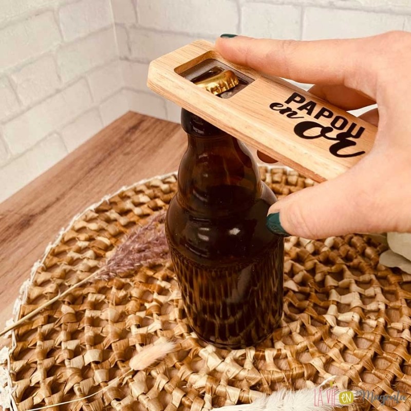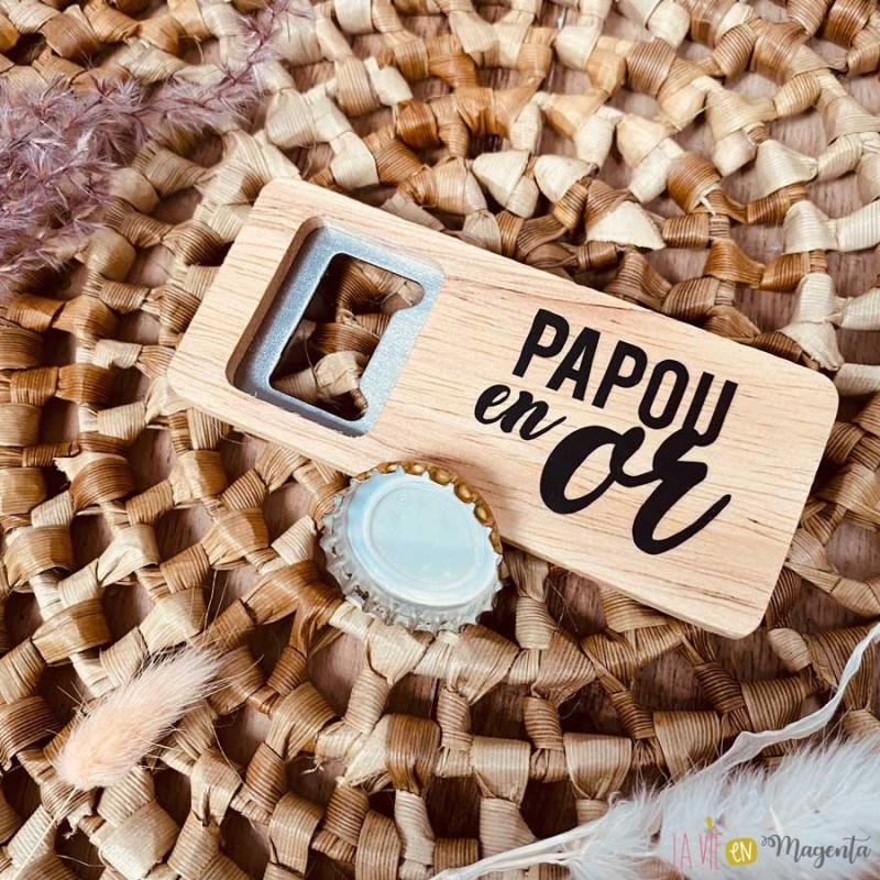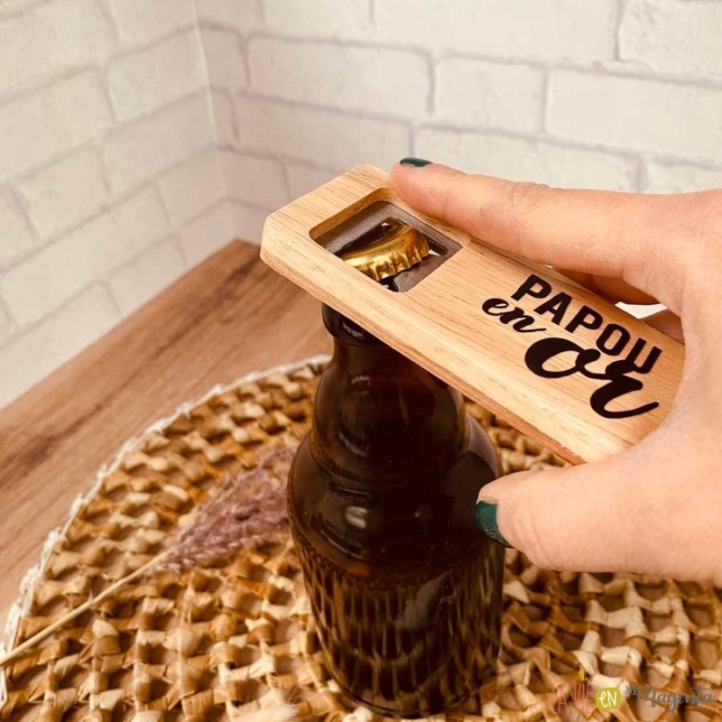 Décapsuleur en bois pour offrir à un papou avec un message accrocheur 'Papou en or'. Ce décapsuleur est parfait pour les amateurs de bières et autre.