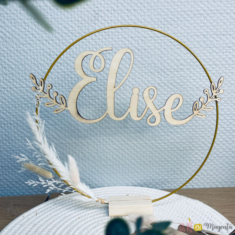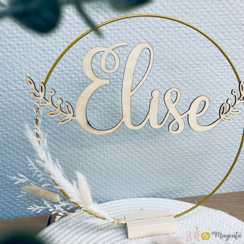 Chaque création est réalisée avec soin dans notre atelier, composée d’une ellipse dorée de 30 cm, d’un prénom découpé en bois et d’un délicat assortiment de fleurs séchées soigneusement disposées.