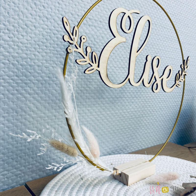 Une jolie décoration personnalisée avec le prénom de l’enfant, composée d’une élégante ellipse dorée, de fleurs séchées naturelles et d’un support en bois. Un cadeau unique et plein de douceur pour une naissance, un baptême ou une jolie déco de chambre.
