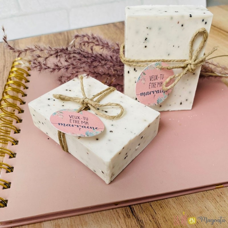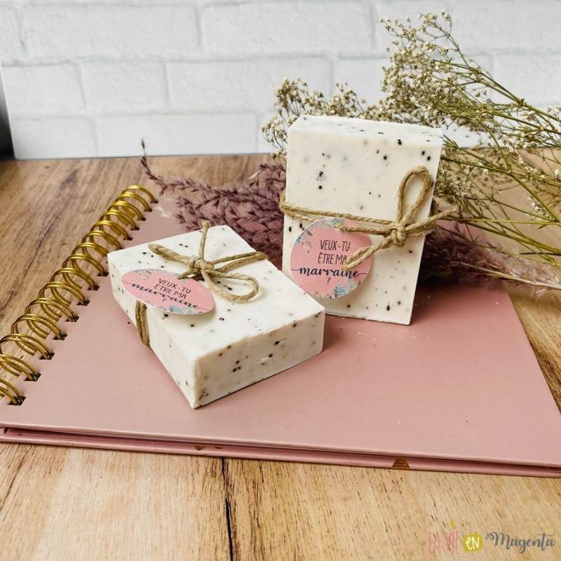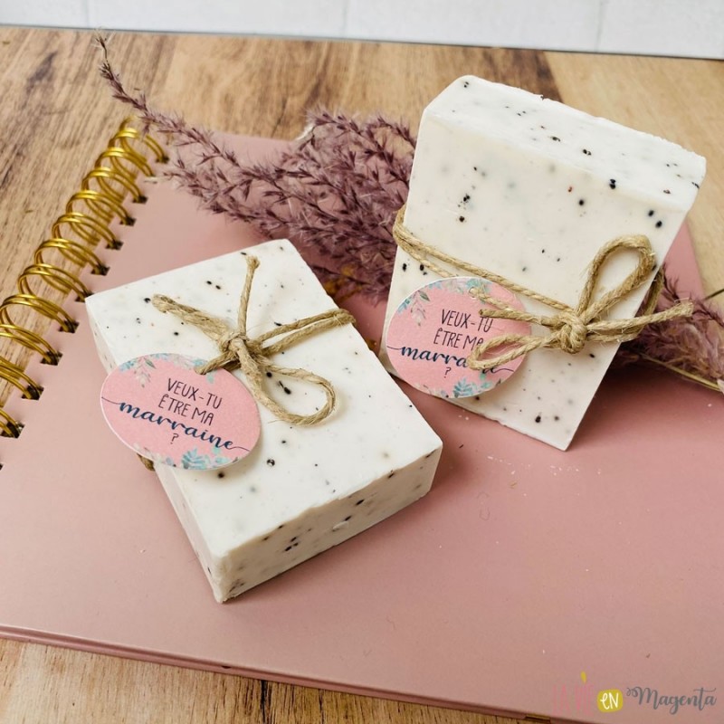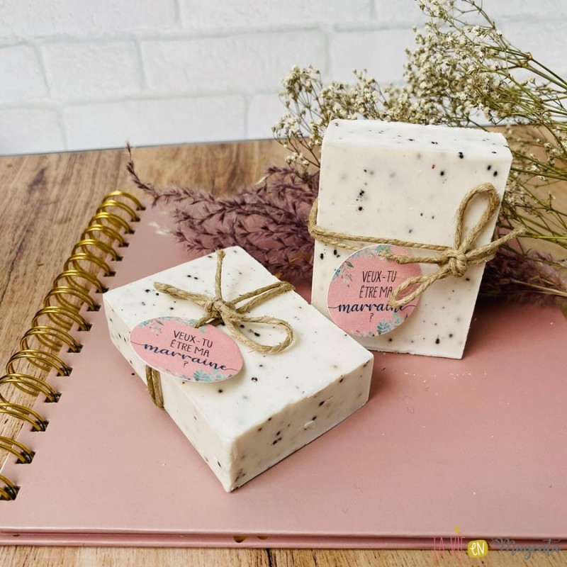 Voici une idée originale à offrir à la future marraine, il s'agit d'un savon solide, de couleur blanc avec graines de kiwi.