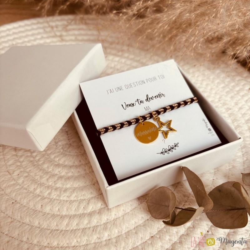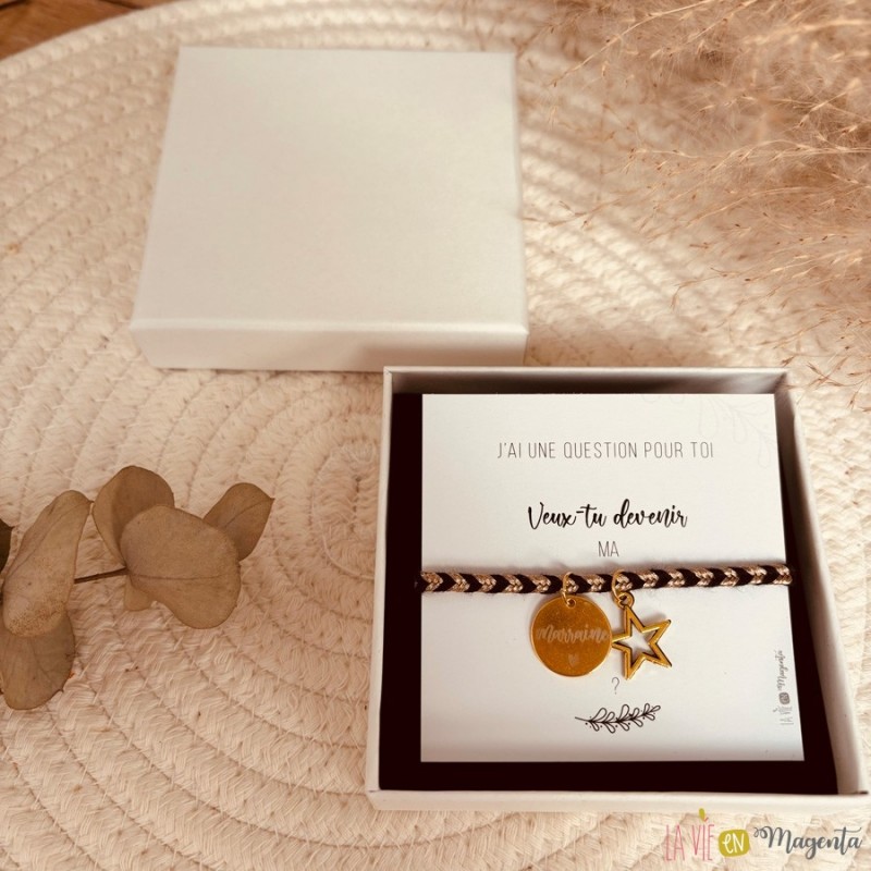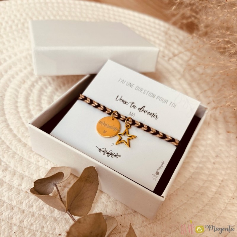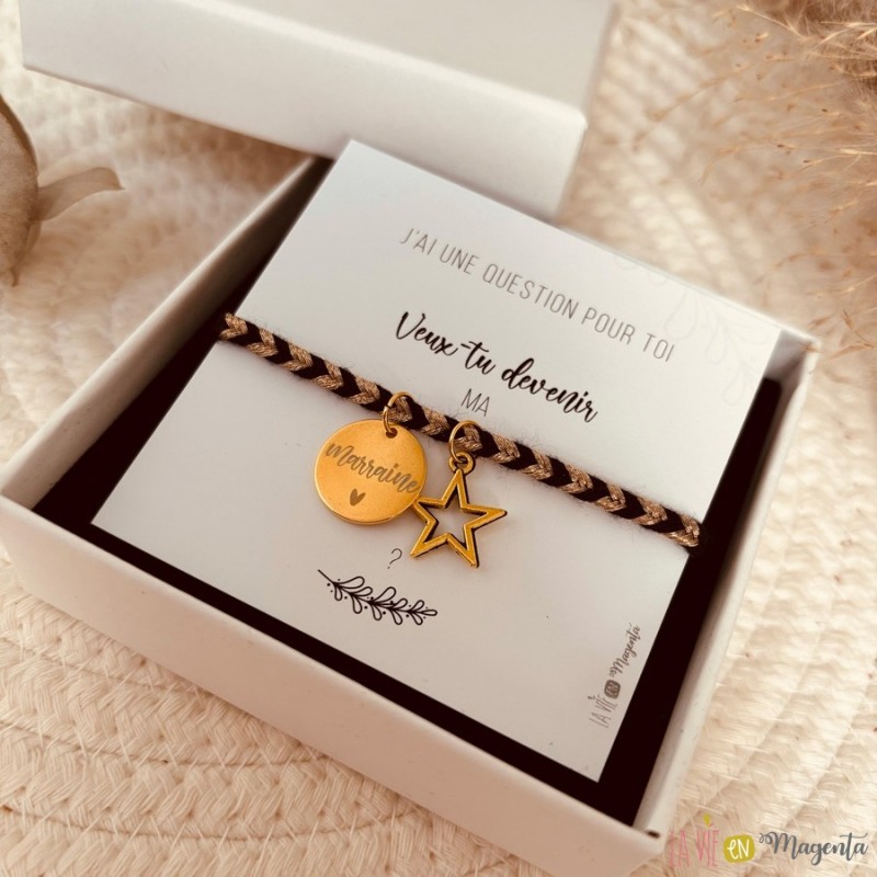 Bracelet pour demande à une marraine avec gravure du mot marraine et d'un petit coeur accompagné de sa petite breloque étoile.