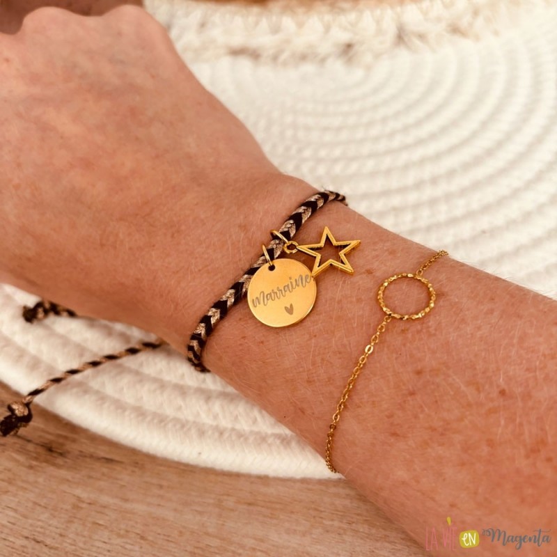 Bracelet en ruban cordon, avec médaille gravée et pendentif étoile.