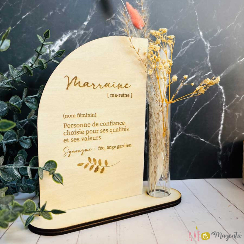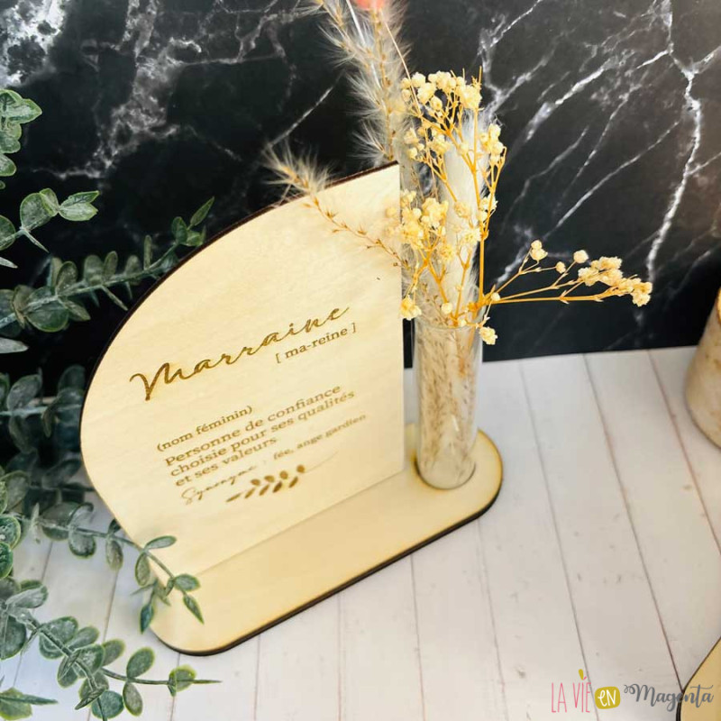 Pancarte Gravée avec Soliflore et Fleurs Séchées – Cadeau Idéal pour une Marraine