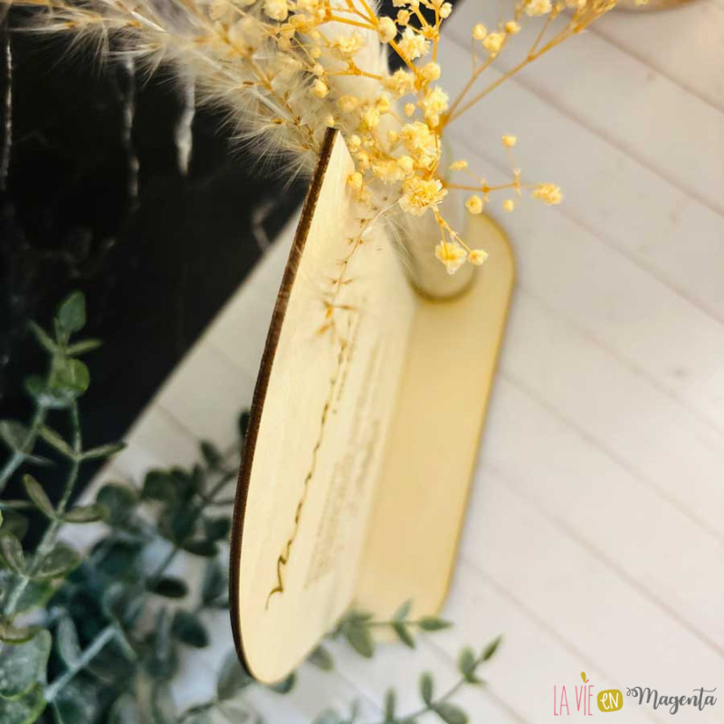Soliflore raffiné : Le support en bois intègre un porte-vase élégant, idéal pour mettre en valeur les fleurs.