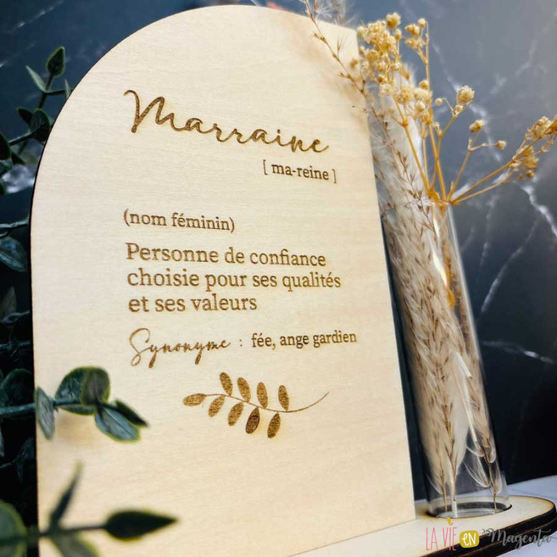 Design élégant : Une pancarte en bois gravée au laser, ornée d’une définition touchante de la marraine.