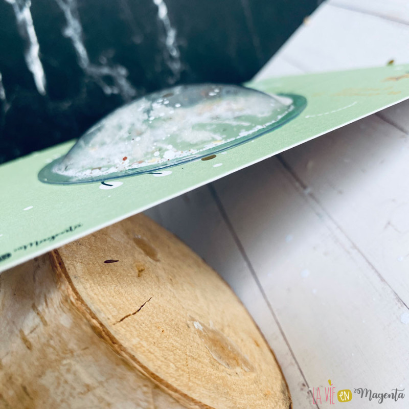 Cette carte surprise est dotée d’un dôme transparent en relief, rempli de paillettes mobiles. Le message est volontairement dissimulé pour créer un effet waouh à la découverte. Un joli souvenir à conserver, bien au-delà de la demande.