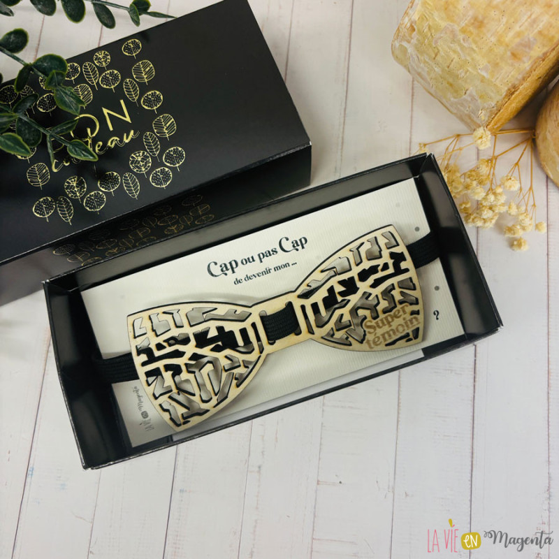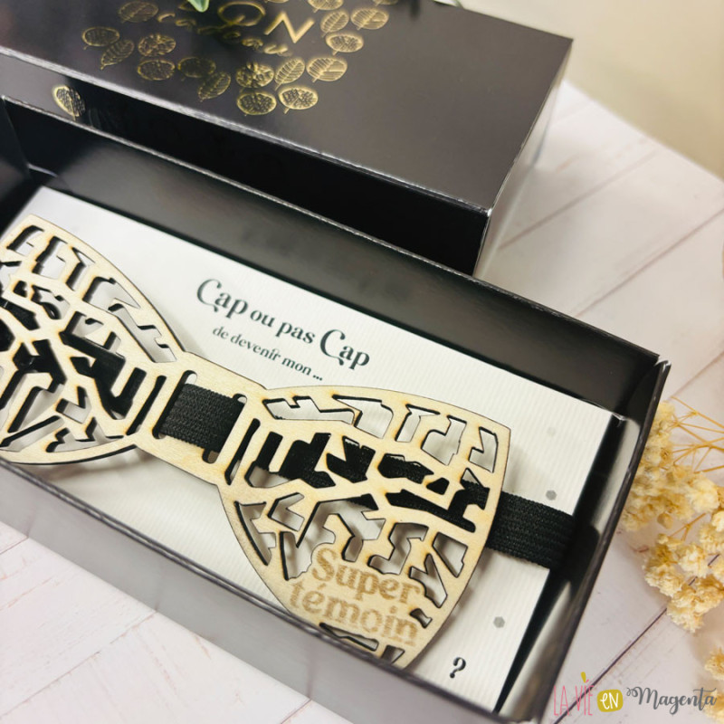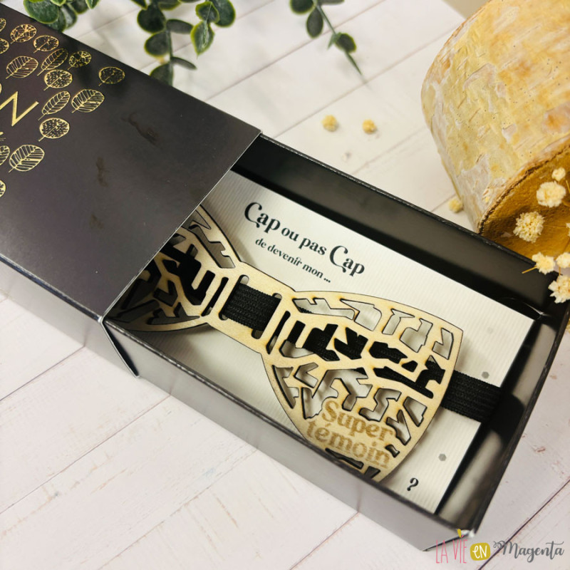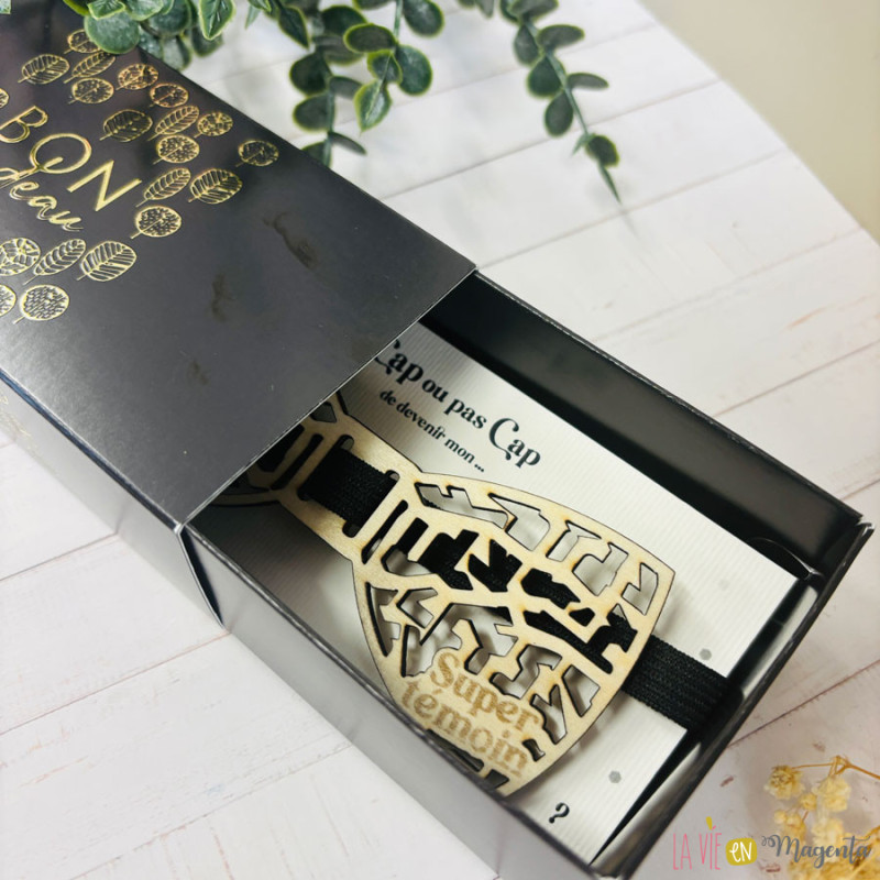 Le coffret noir, au design sobre et élégant, s’ouvre en glissière. À l’intérieur, on découvre le nœud papillon en bois, posé sur une carte où figure la question de la demande, par exemple Super témoin ou Garçon d’honneur. L’objet est suffisamment beau pour être porté le jour J, puis conservé comme souvenir précieux.