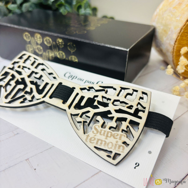 Nœud papillon en bois gravé, pièce centrale du cadeau