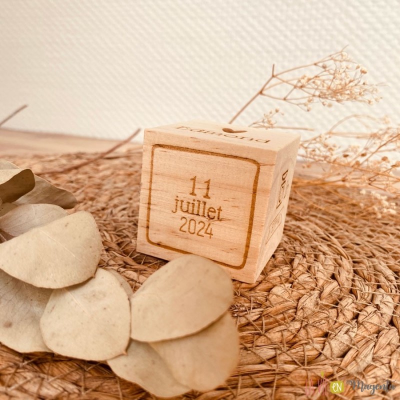 - En raison des variations dans le bois, votre cube peut différer légèrement de l'image illustrée et l’intensité de la gravure également selon la dureté du bois.
