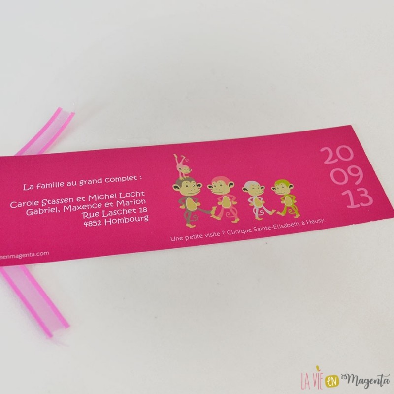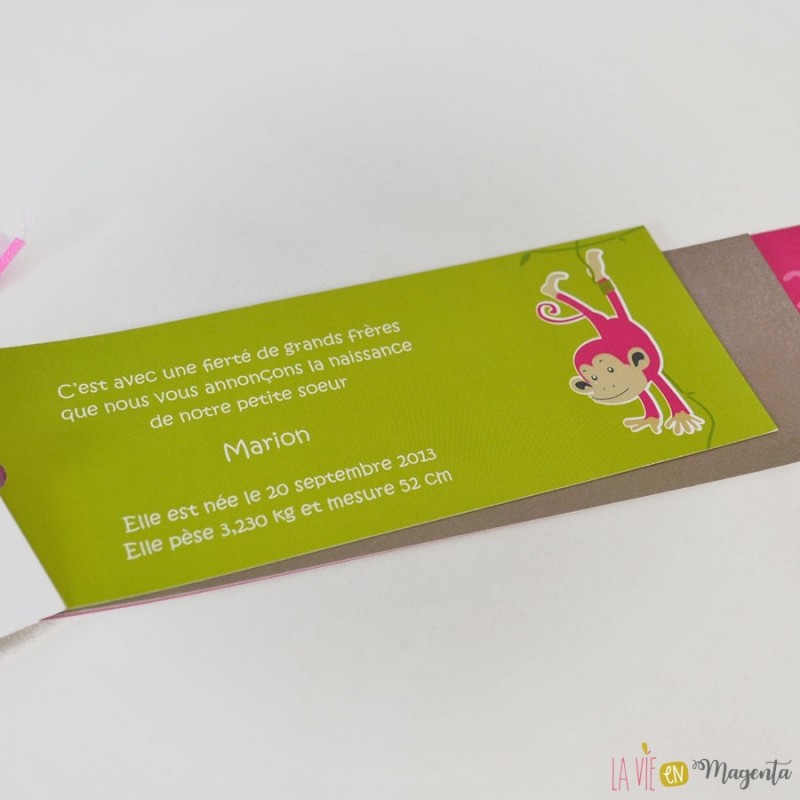 Faire-part de naissance original par sa forme (il se déploie tel un nuancier) mais également par son design : un petit singe faisant des péripéties.
