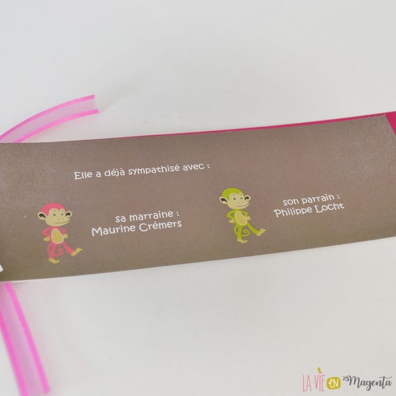 Volets après volets, vos proches découvriront les différentes informations sur la naissance de votre bébé. D'autres singes sont également incorporé au projet : les parents, la marraine et le parrain.