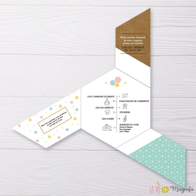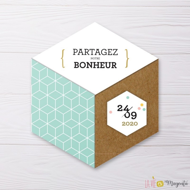 Vous souhaitez réaliser une annonce sortant de l'ordinaire ? Ce faire-part de mariage en forme d'hexagone est ce qu'il vous faut pour être tendance et original à la fois !