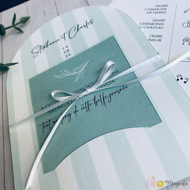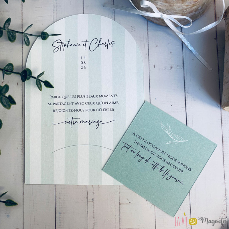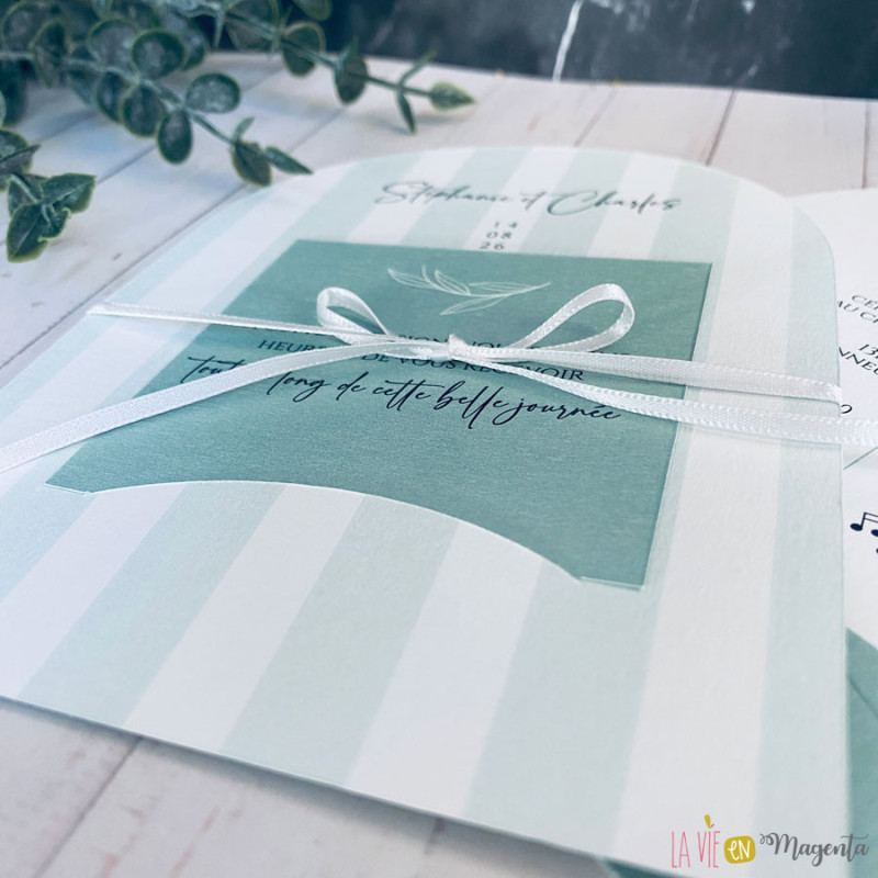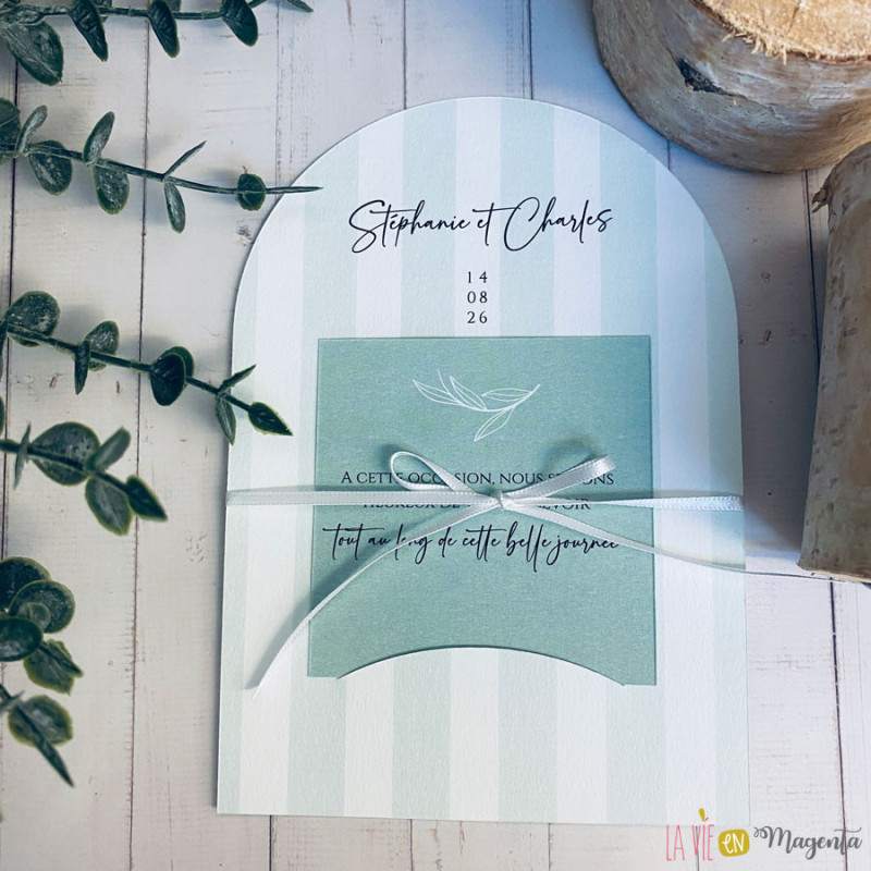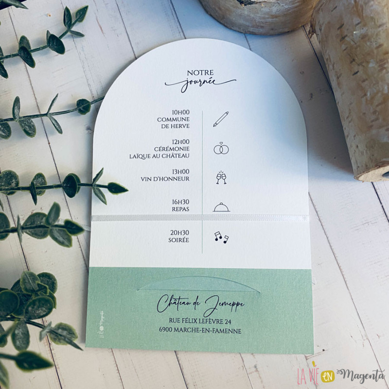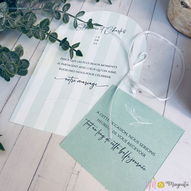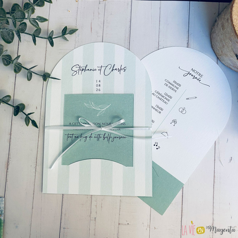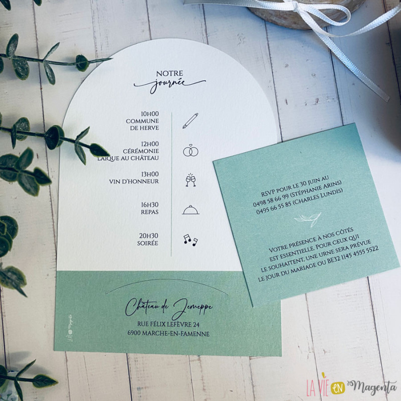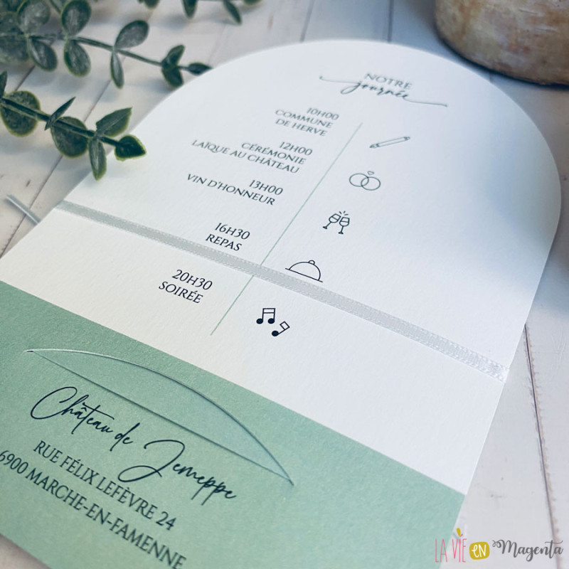 Le faire-part se compose de deux éléments imprimés en recto/verso, dans une palette de vert sauge, tendance et apaisante.