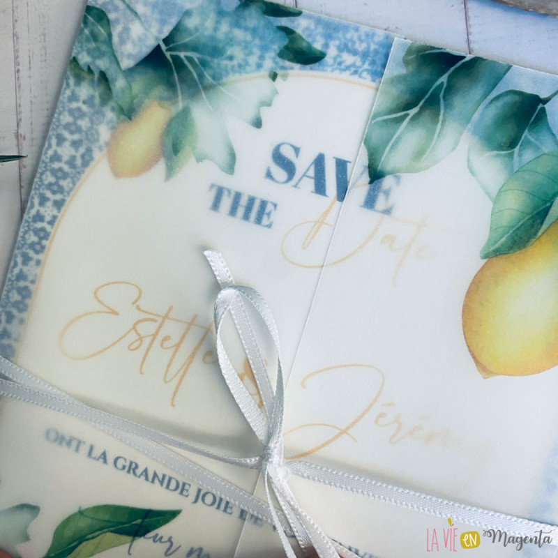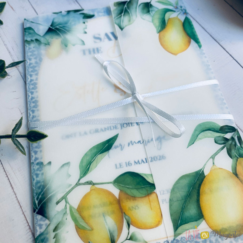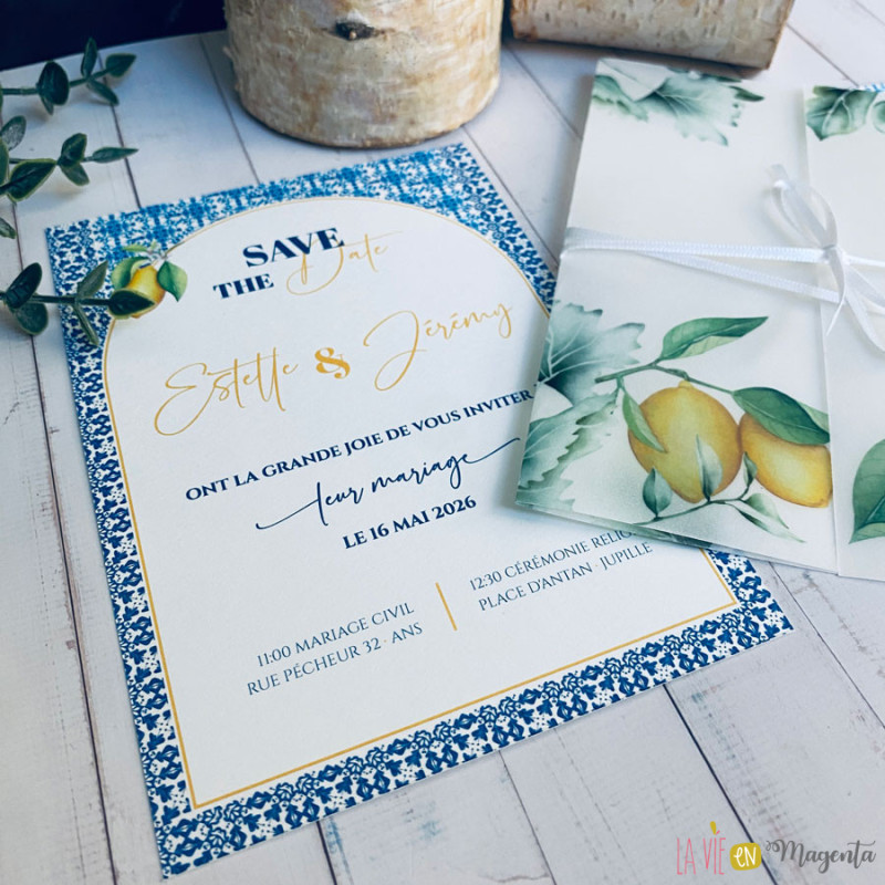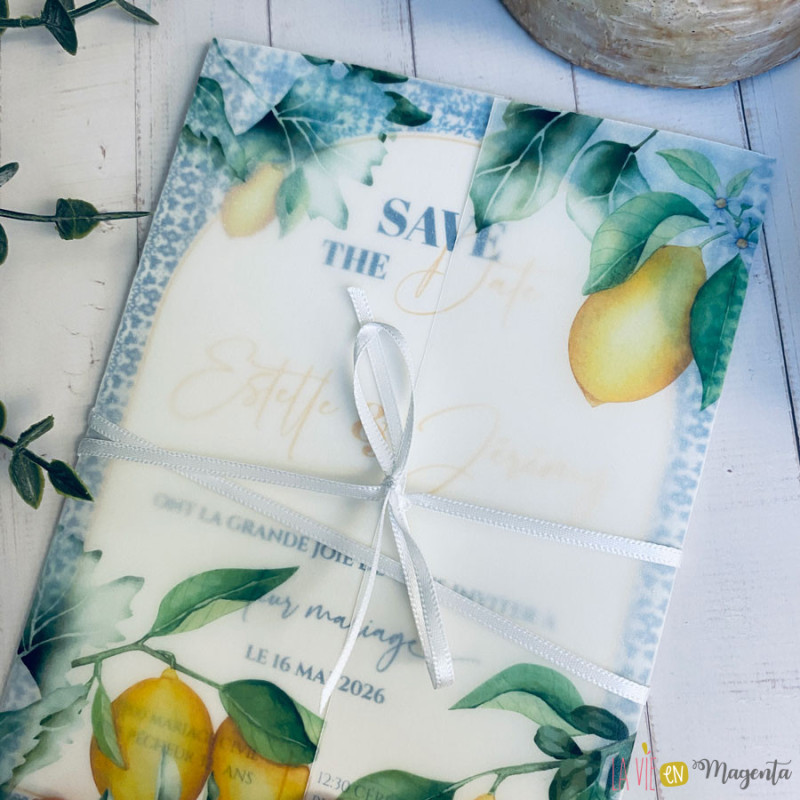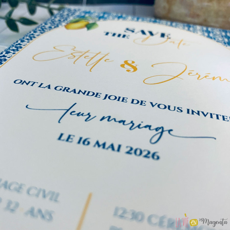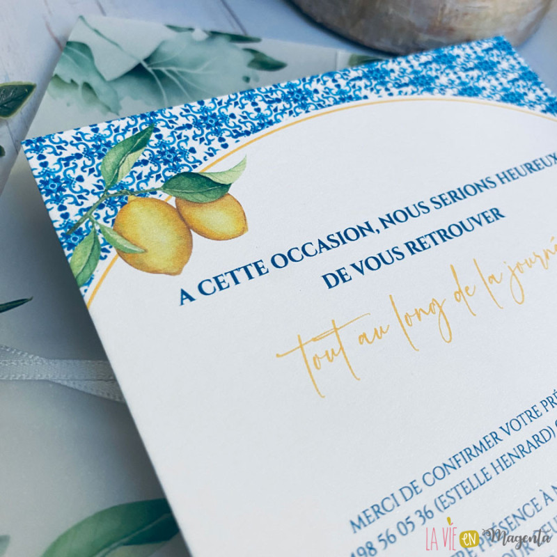 Entièrement personnalisable, ce modèle est imaginé et imprimé dans notre atelier. Il est idéal pour un mariage estival, chic et convivial, au charme italien assumé.