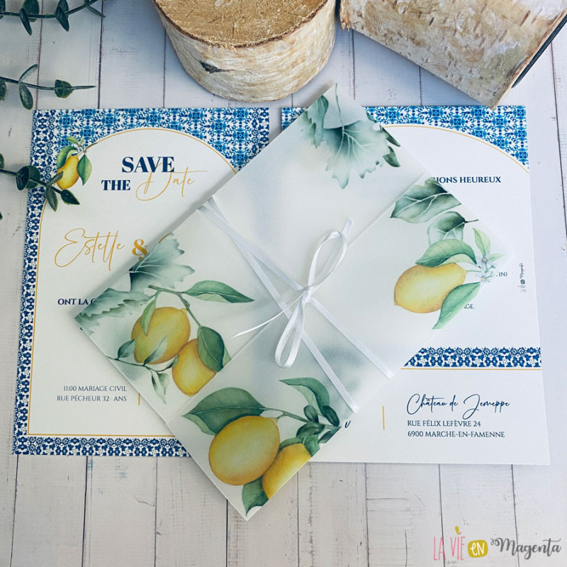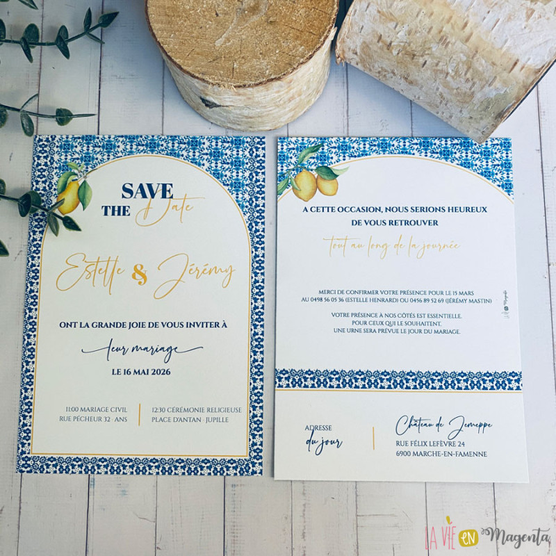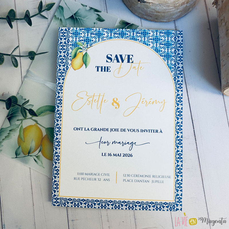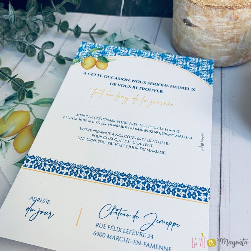 Le carton principal, au format 110 × 157 mm, met en valeur une palette de couleurs méditerranéennes : bleu azur et jaune soleil, pour une ambiance chaleureuse et raffinée.