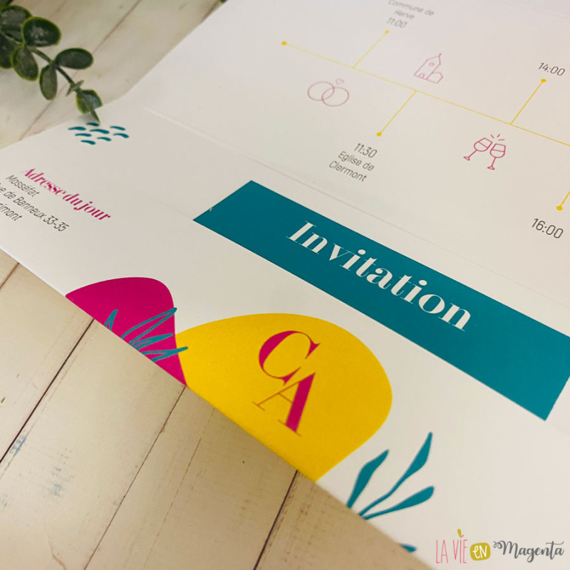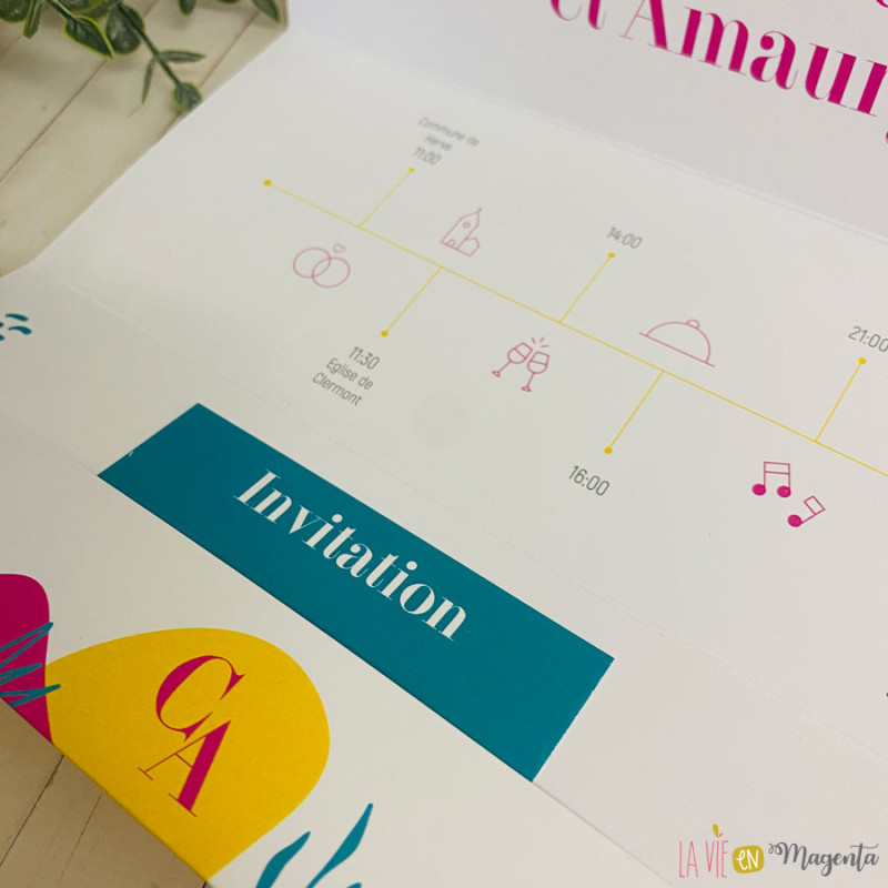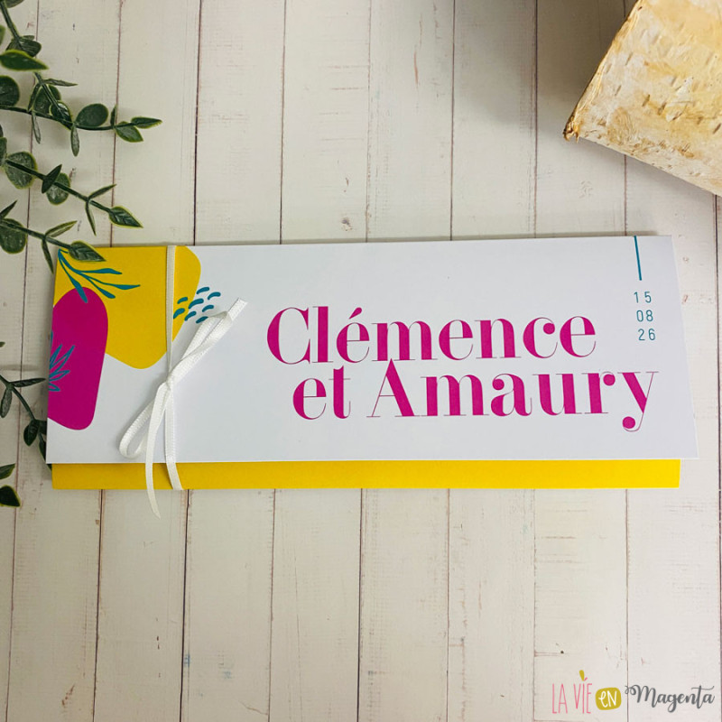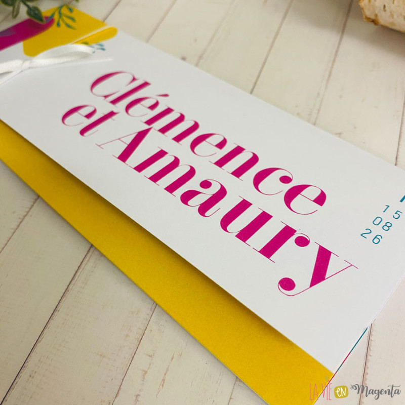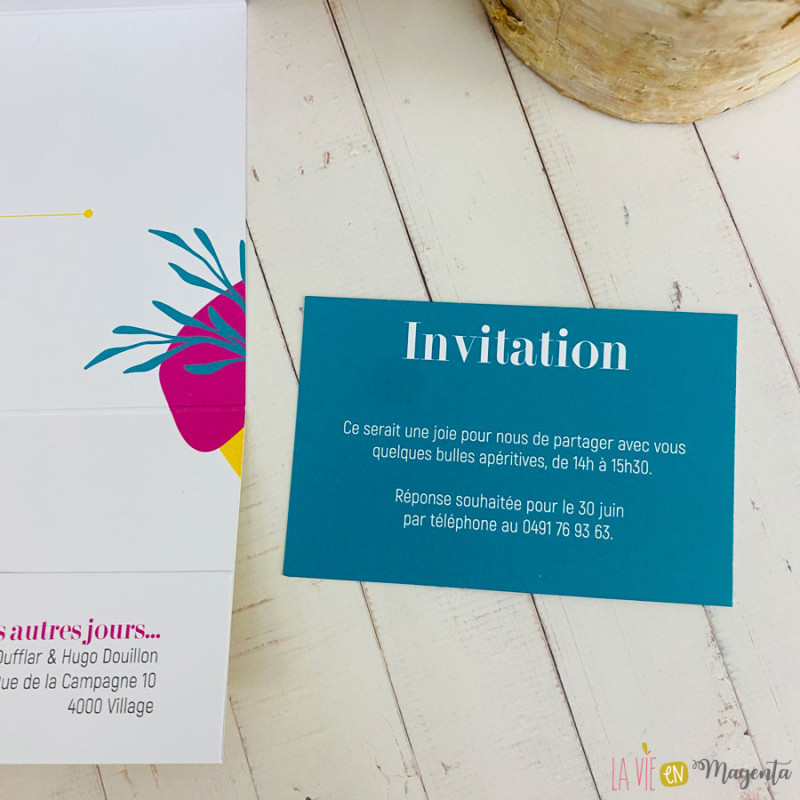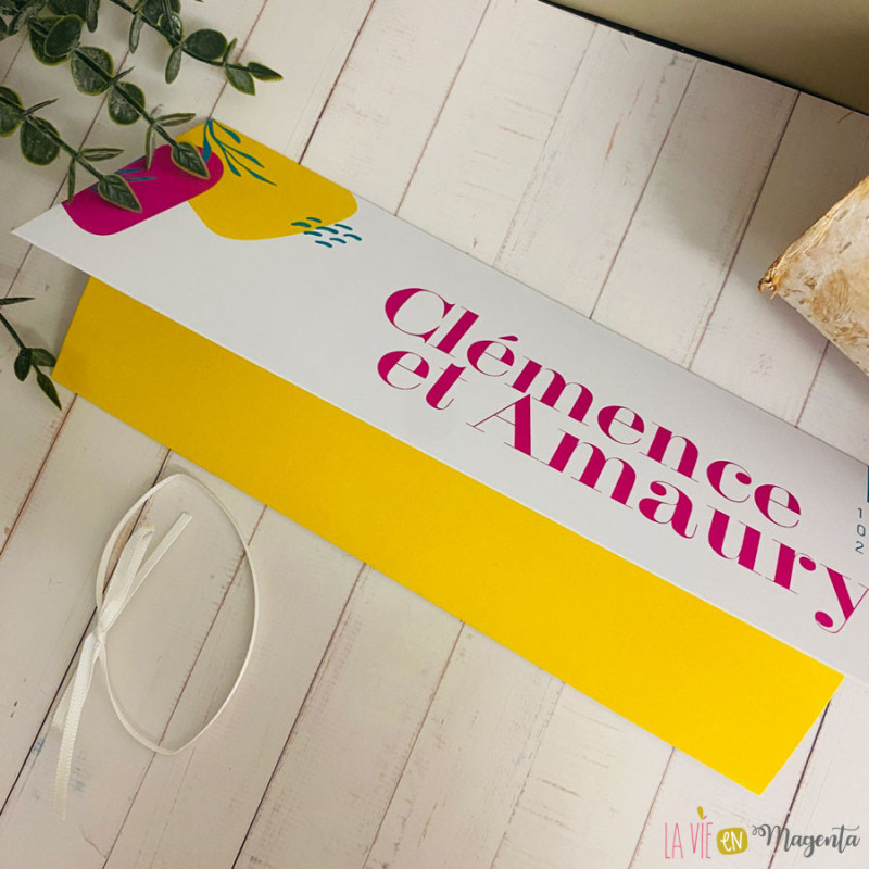 L’ensemble est délicatement noué à l’aide d’une jolie ficelle, ajoutant une touche chaleureuse et authentique à ce faire-part haut en couleur.