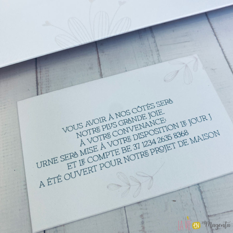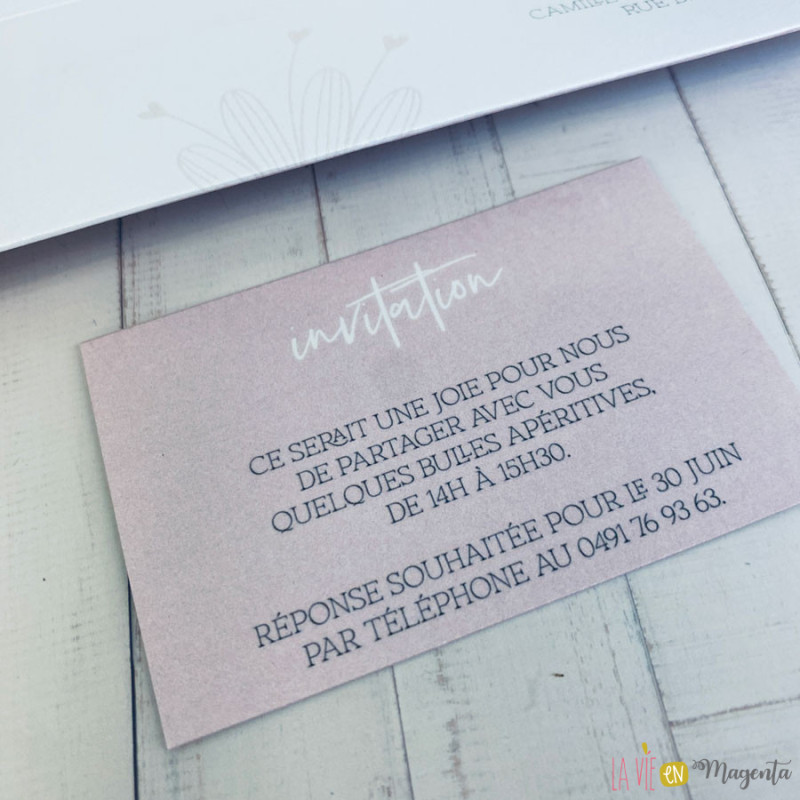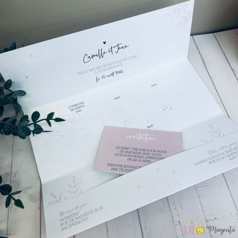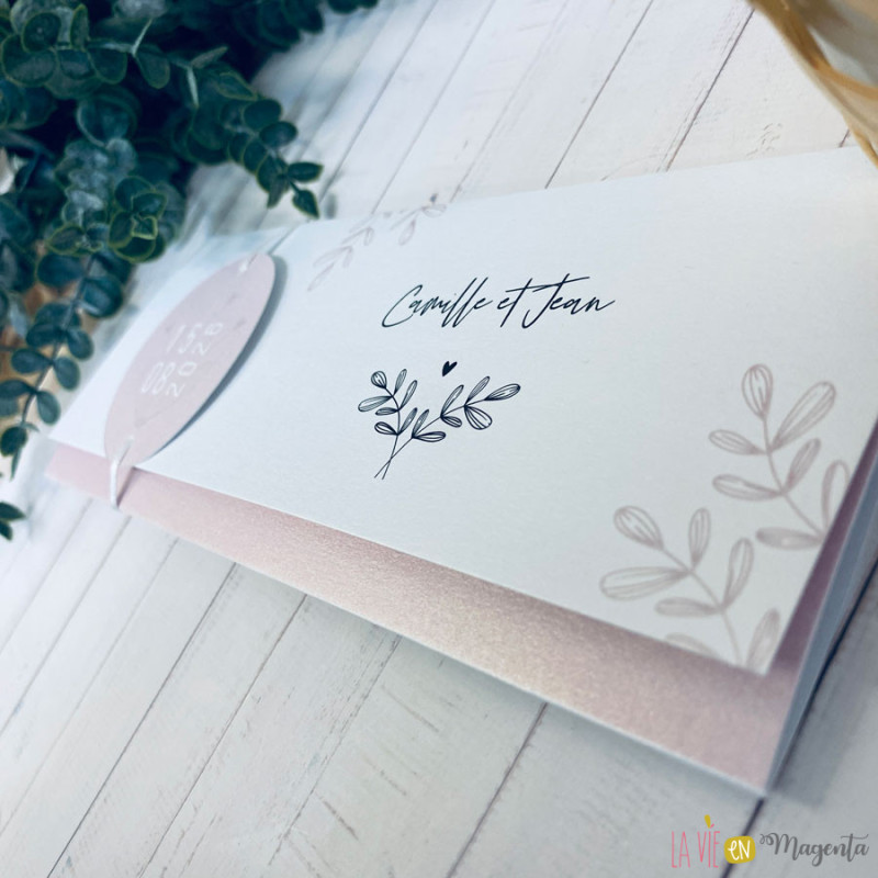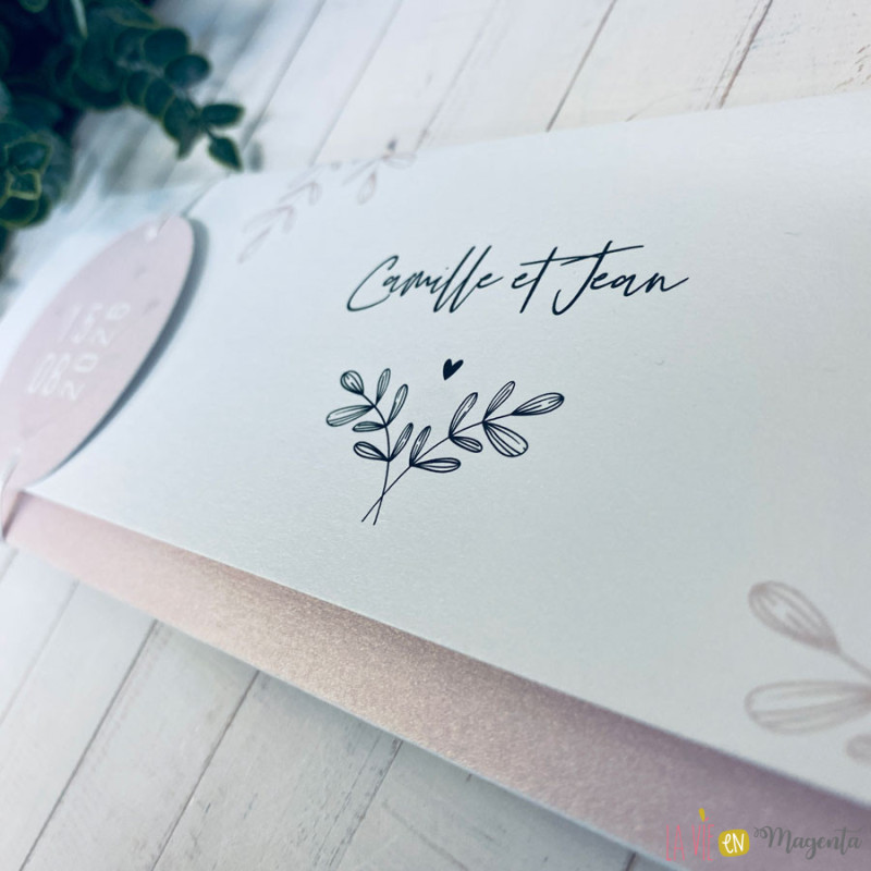 De délicats motifs de feuillage rose et noir, accompagnés d’un petit cœur discret, viennent habiller le faire-part avec finesse et poésie.