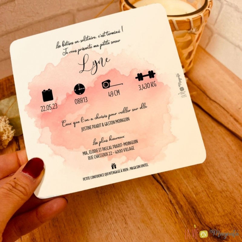 Un joli faire-part de naissance tout en douceur avec ses couleurs douces aquarelles.