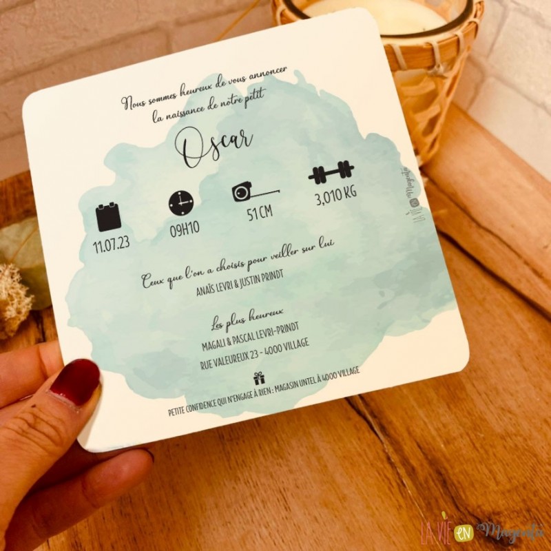 Un joli faire-part de naissance tout en douceur avec ses couleurs douces aquarelles.