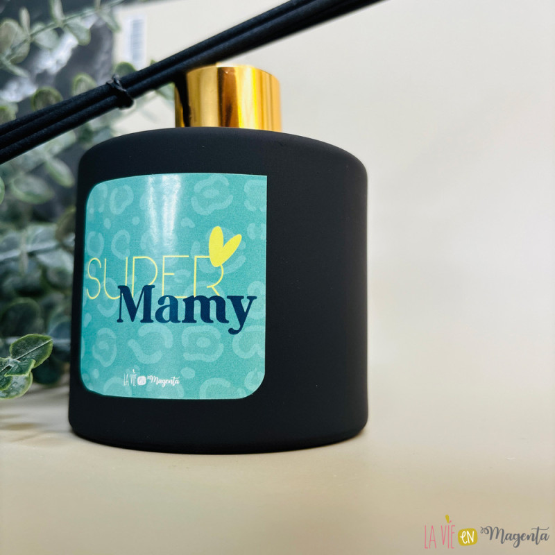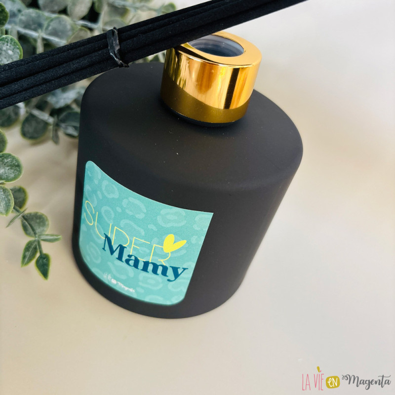 Diffuseur parfum noir mat avec bouchon doré et bâtonnets noirs. Messages au choix : humour, amitié, amour ou encouragement. Un cadeau déco original, idéal pour un anniversaire, une crémaillère ou une petite attention. Parfum élégant et design moderne.