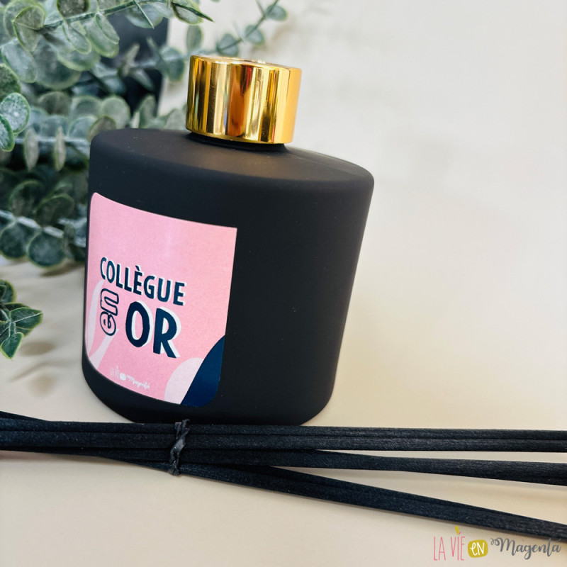 Diffuseur parfum noir mat avec bouchon doré et bâtonnets noirs. Messages au choix : humour, amitié, amour ou encouragement. Un cadeau déco original, idéal pour un anniversaire, une crémaillère ou une petite attention. Parfum élégant et design moderne.