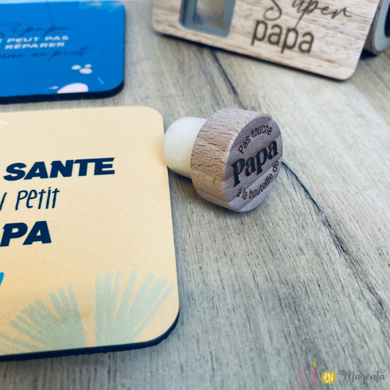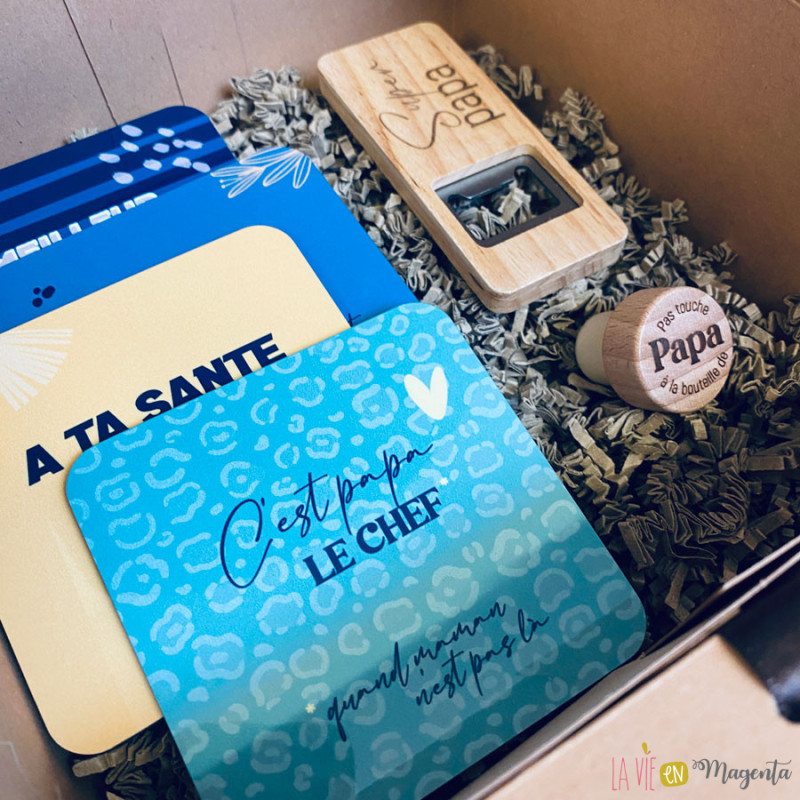 Coffret cadeau pour papa comprenant 4 sous-verres personnalisés avec des messages humoristiques ou tendres, un décapsuleur en bois et un bouchon réutilisable. Une idée cadeau originale et pleine d’attention, parfaite pour la fête des pères, un anniversaire ou Noël.