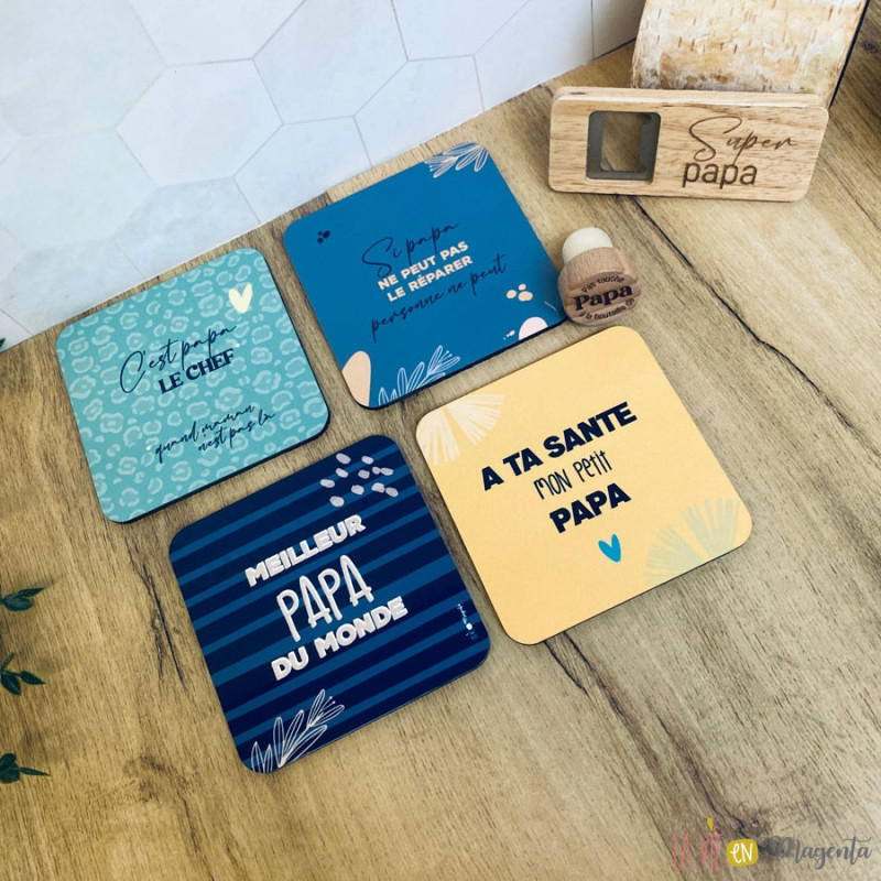 À l’intérieur, papa découvrira 4 sous-verres personnalisés avec des messages humoristiques ou remplis de tendresse, parfaits pour apporter une touche sympathique à ses apéritifs ou ses moments de convivialité.