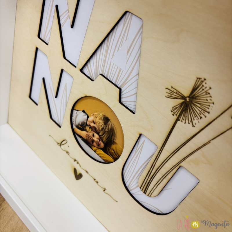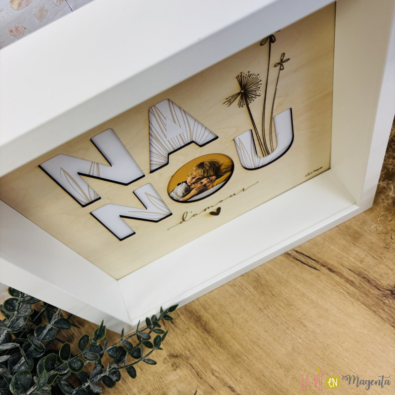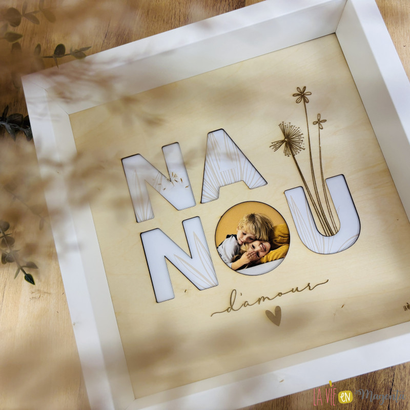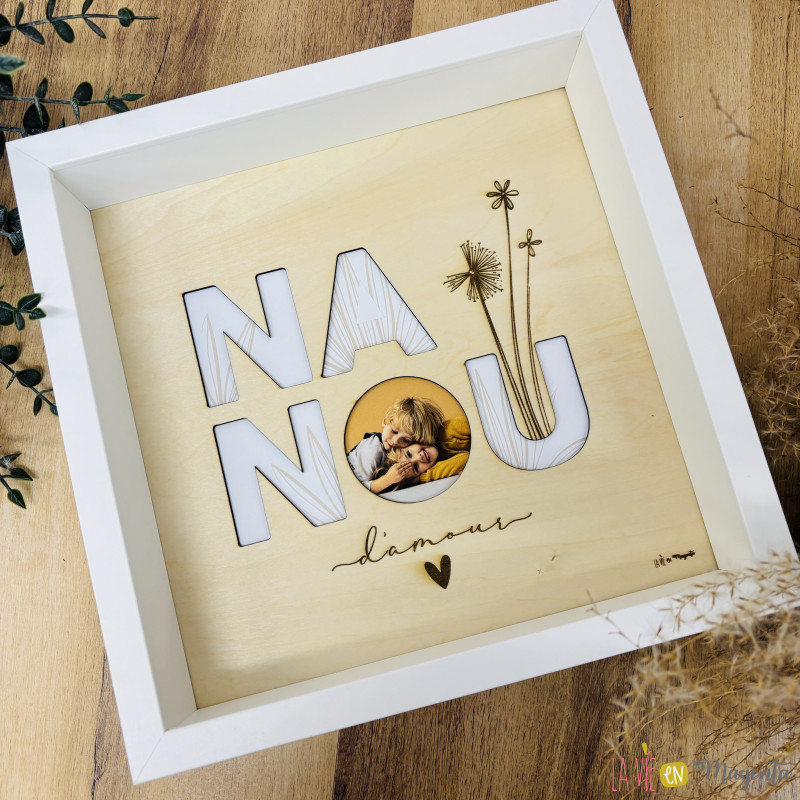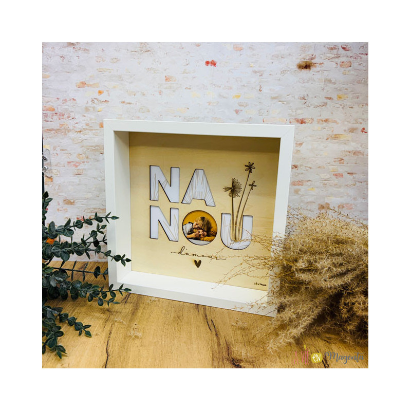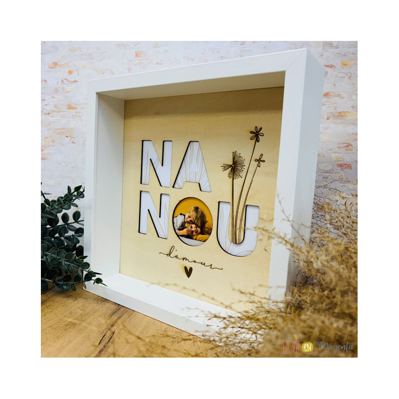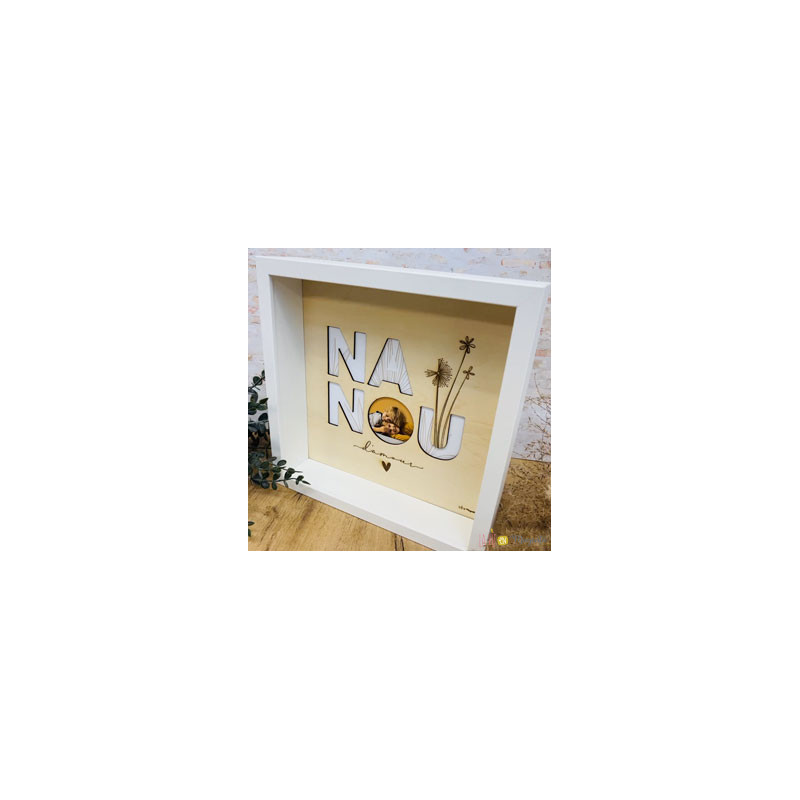 Le cadre blanc en relief Nanou d'amour contient une plaquette en bois gravée et découpée, accompagnée d’une photo que l’on voit à travers les lettres “Nanou” découpées. Vous nous envoyez la photo, nous l’imprimons pour qu’elle apparaisse derrière le texte gravé, créant un rendu poétique et touchant.