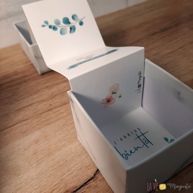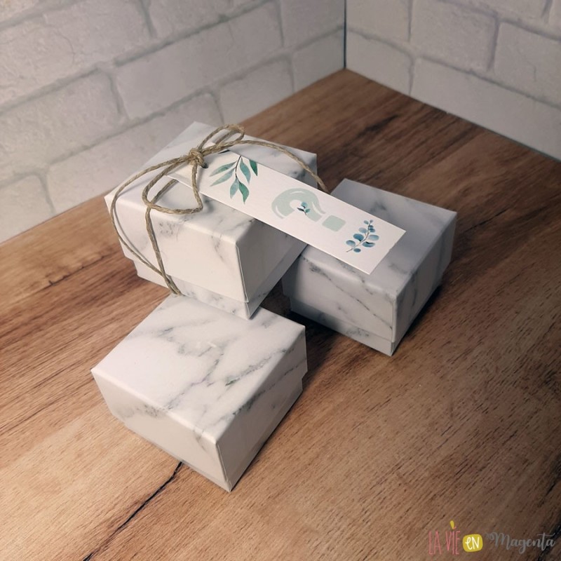 Boite en effet marbre avec ficelle naturelle. Petite étiquette qui laisse deviner une surprise sans en dire plus.