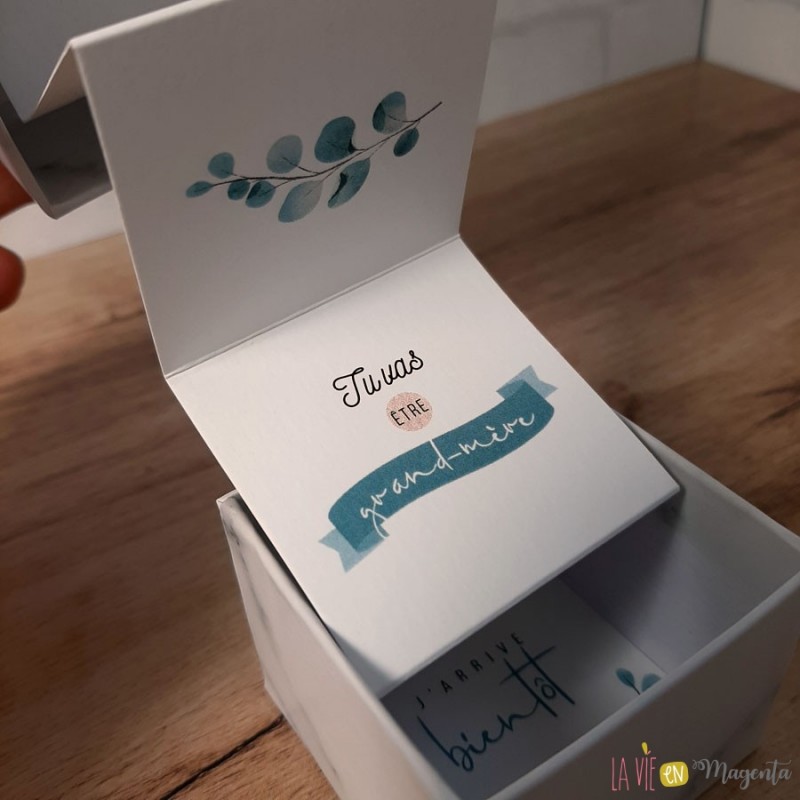 A l'intérieur, l'annonce de grossesse pour la grnd-mère, en ouvrant, elle pourra découvrir le message.