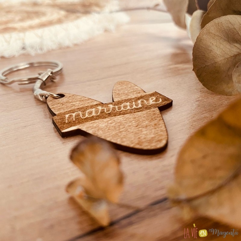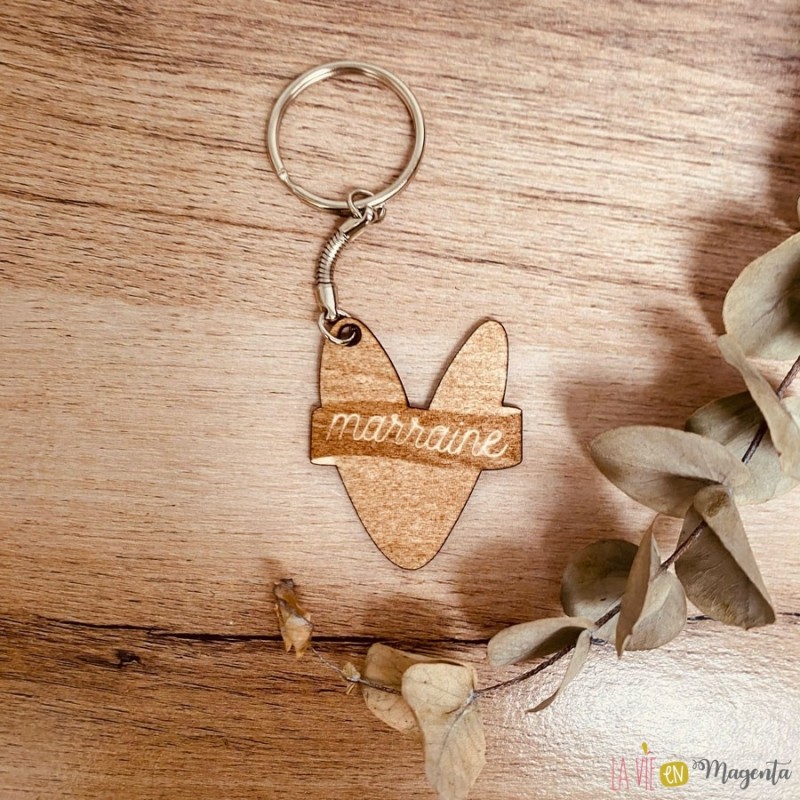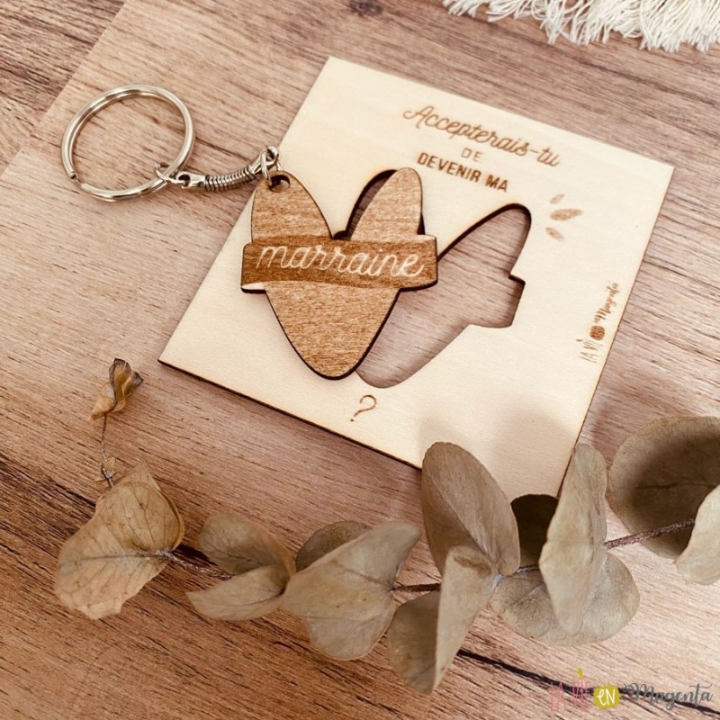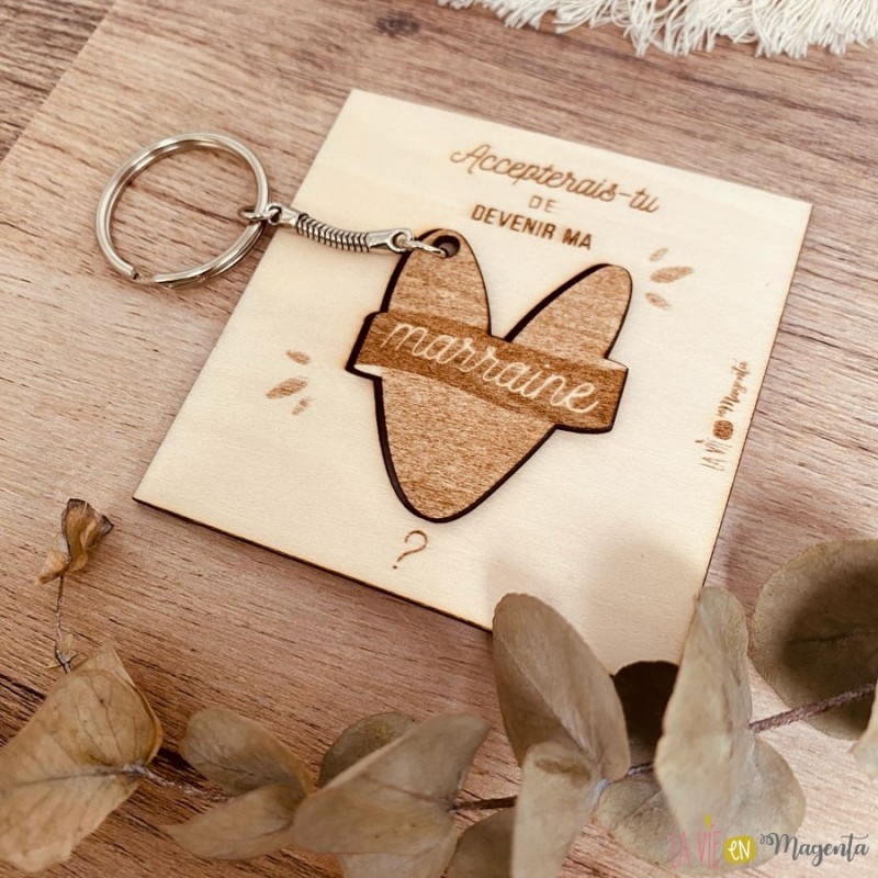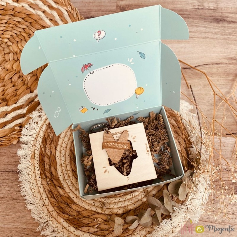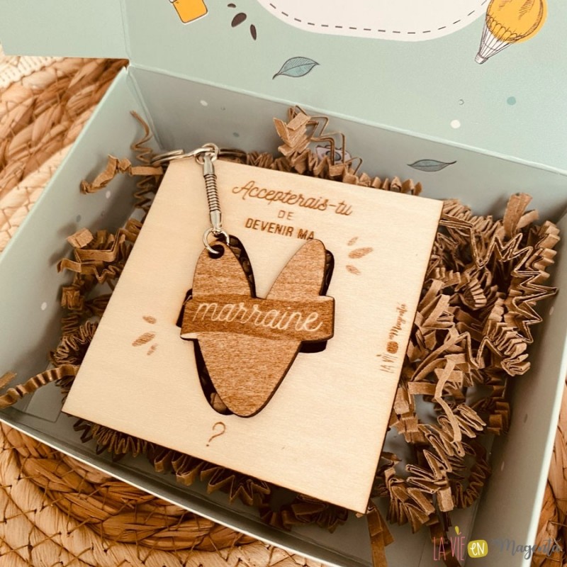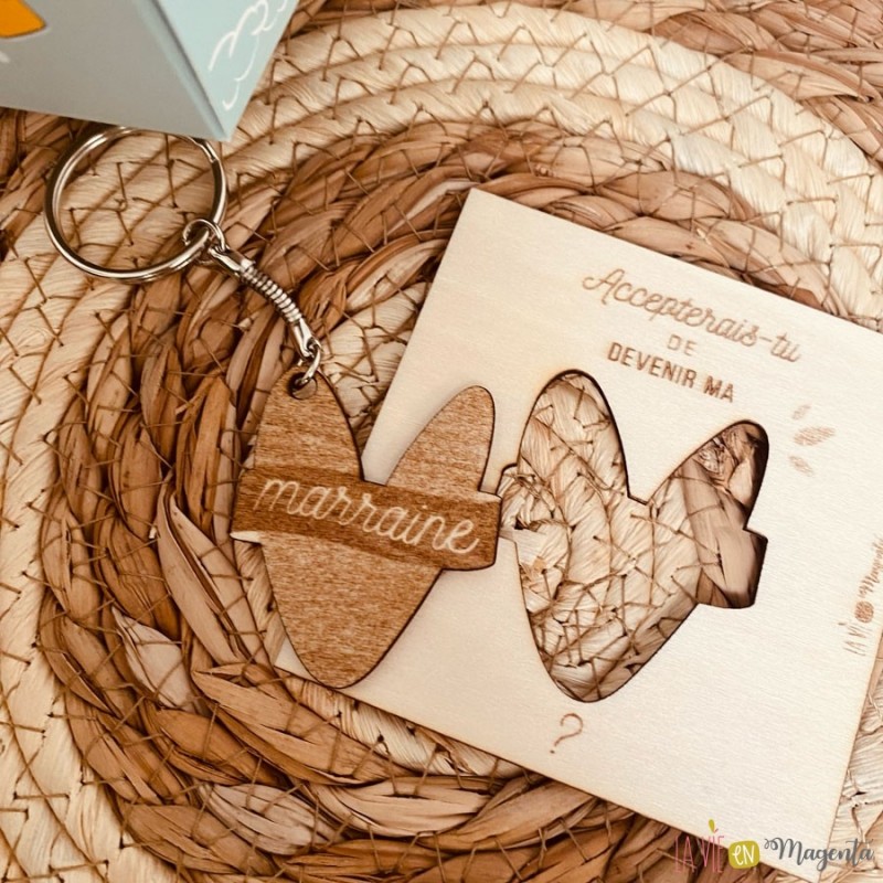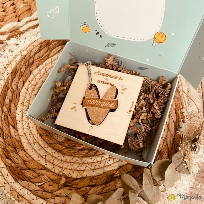 A l'intérieur, la demande 'Accepterais-tu de devenir ma marraine ?' gravée sur un carré + porte clé en bois de bouleau. Un cadeau utile que la future marraine pourra garder en souvenir.