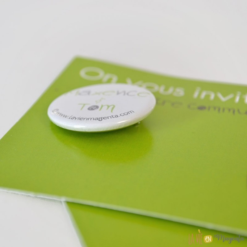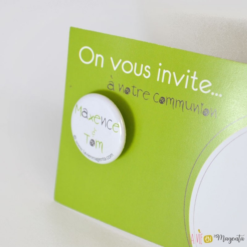 Invitation communion originale agrémentée d'un badge à épingle (32mm).