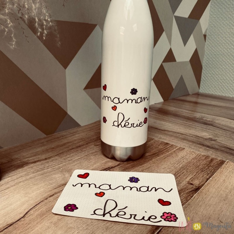 Le prix demandé comprend la mise en scène de votre petit mot sur la bouteille isotherme (petit mot ou dessin sur fond blanc). Si le dessin ou mot est réalisé sur un papier coloré ou à motifs, un devis peut être calculé avant de commencer la création