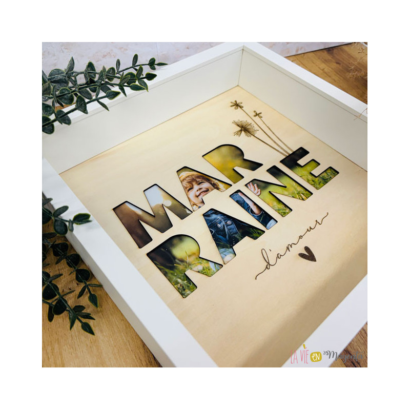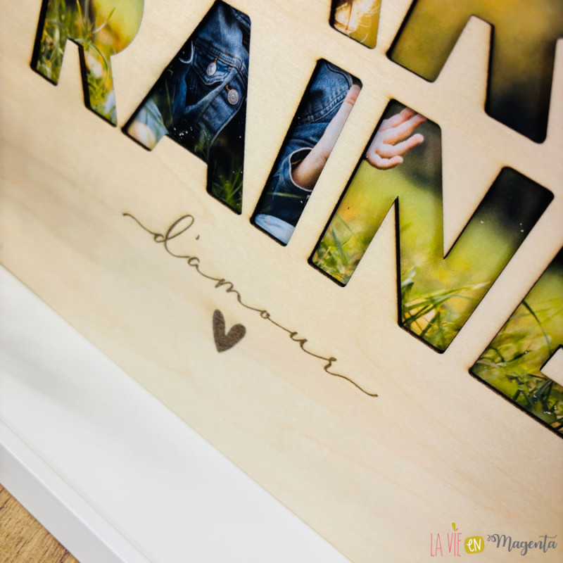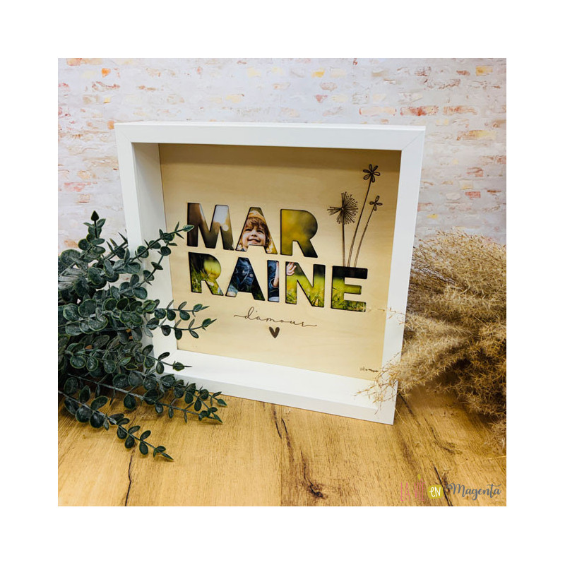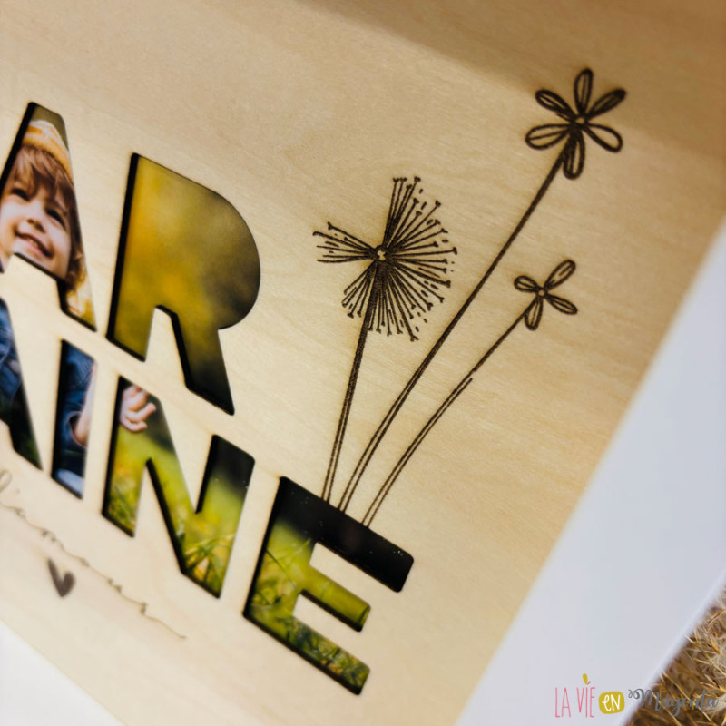 Le mot "marraine" est ajouré dans le bois afin de laisser apparaître une photo placée à l’arrière du texte, pour un rendu à la fois tendre, moderne et très émotionnel.