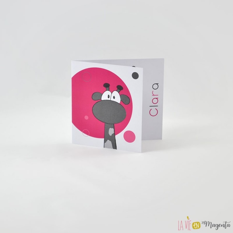 Le faire-part naissance 'Elise la girafe' met en scène une petite girafe dans des tons peps qui annoncera avec beaucoup de dynamisme la naissance de votre enfant. Une fois le faire-part fermé, le prénom reste visible grâce à sa couverture légèrement plus courte, laissant apparaître le prénom inscrit à l'intérieur du faire-part naissance.