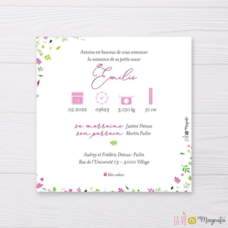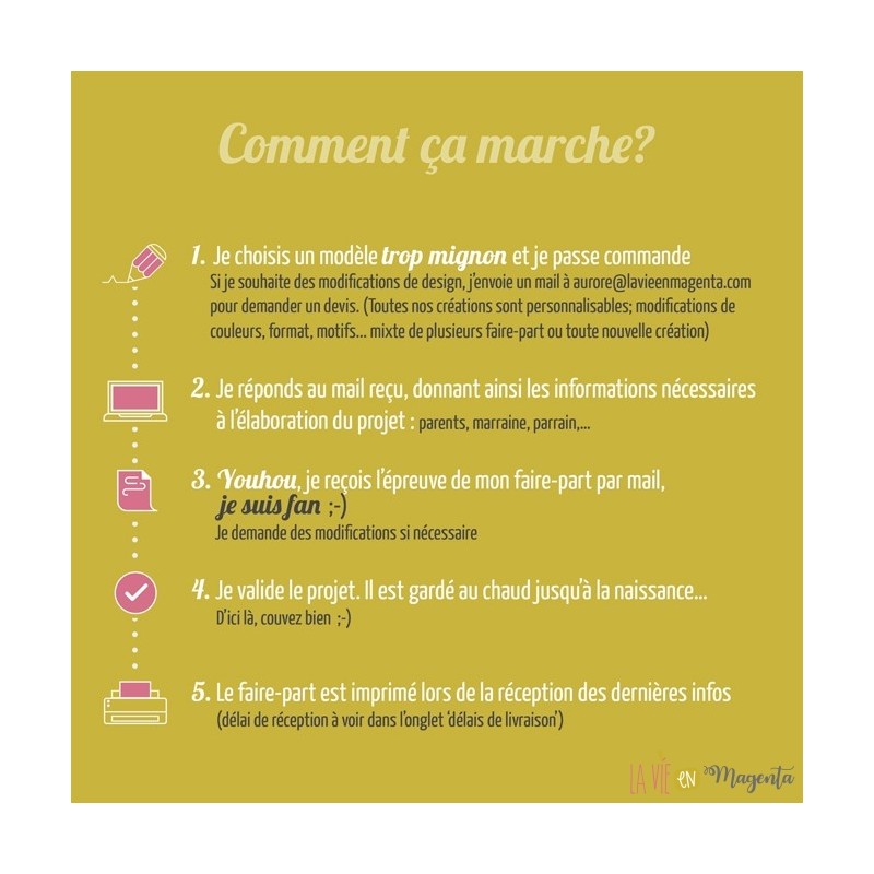 L’ensemble de nos créations sont entièrement personnalisables, ce faire-part de naissance l'est aussi : vous souhaitez changer le coloris, les motifs et/ou le format ? N'hésitez pas à nous soumettre vos envies !