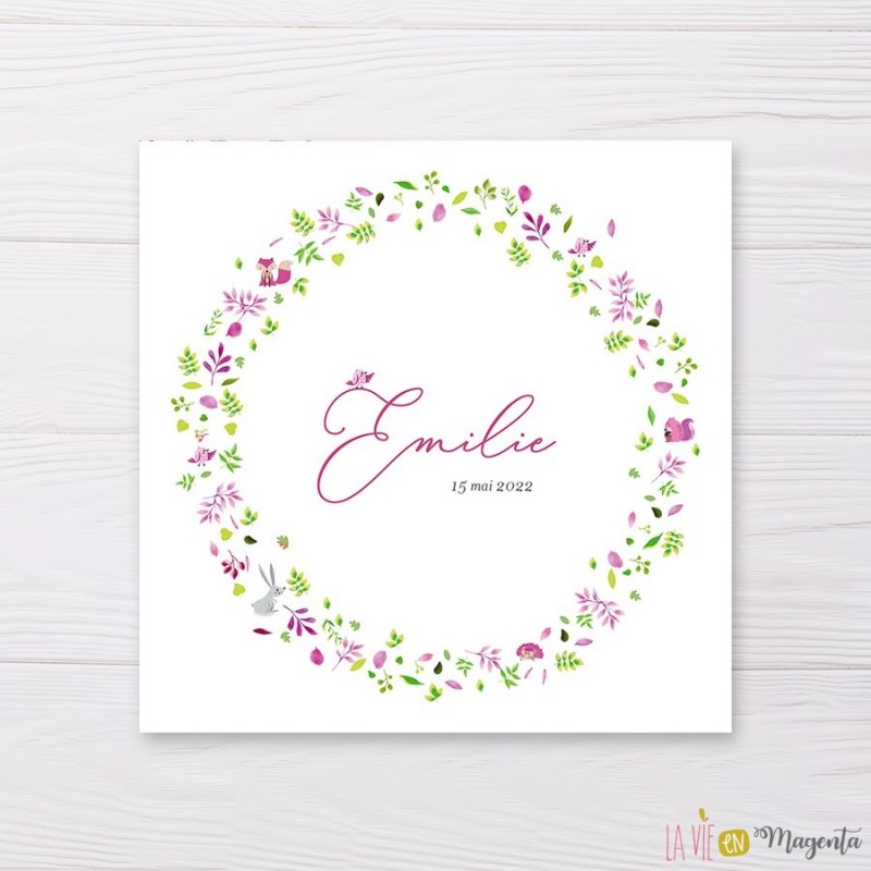 Petit faire-part de naissance aux couleurs peps et sur le thème des animaux de la forêt (tout en sobriété par ses motifs discrets), il annoncera avec charme la naissance de votre bambin !