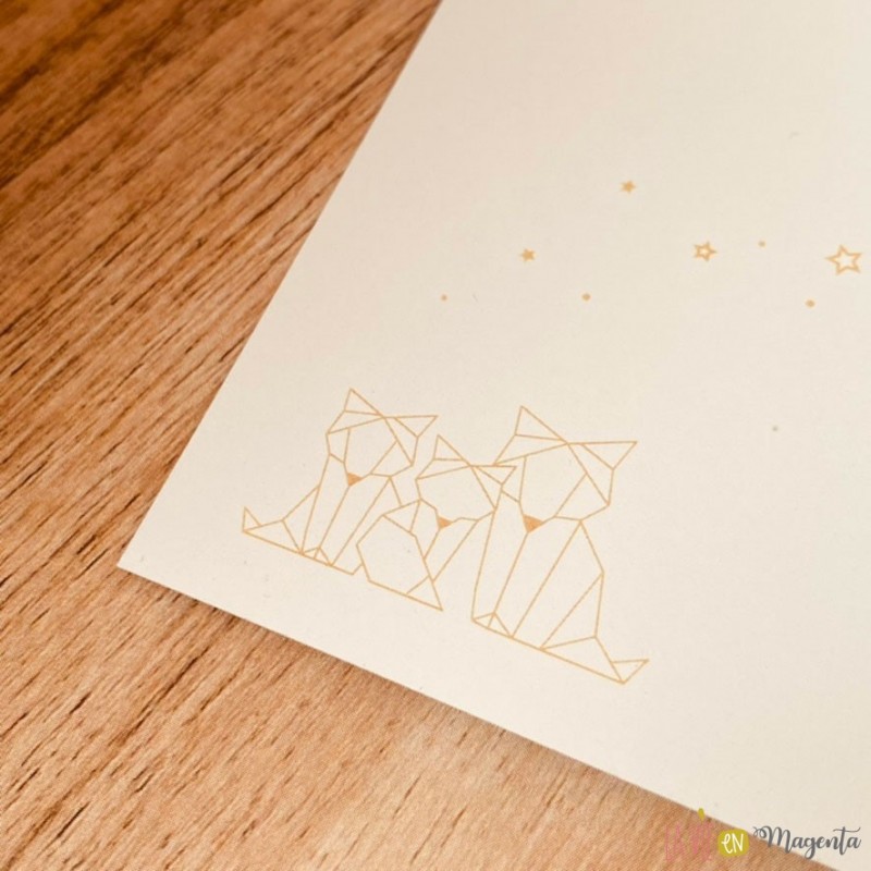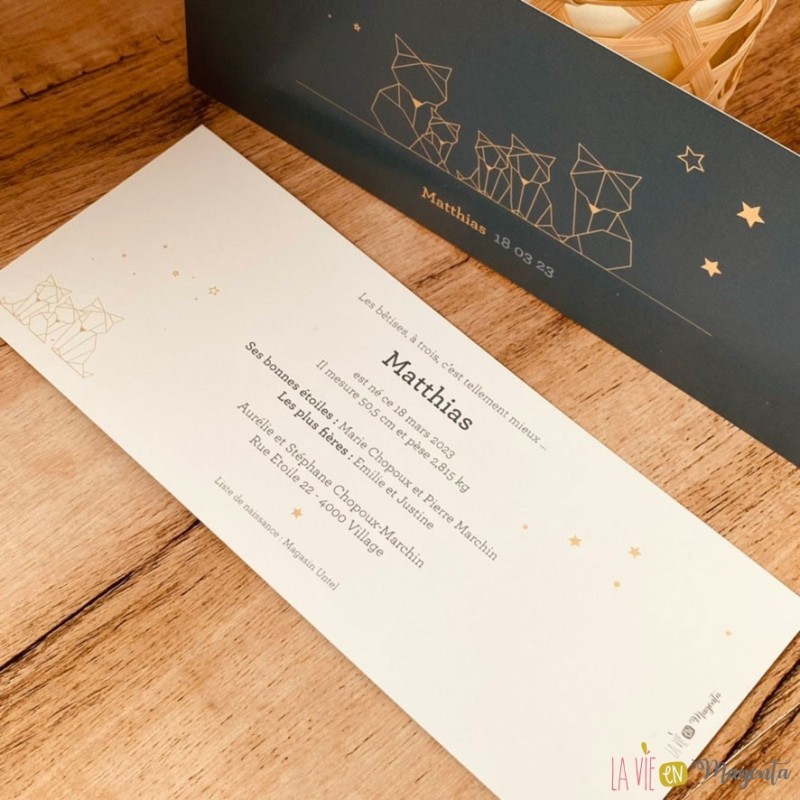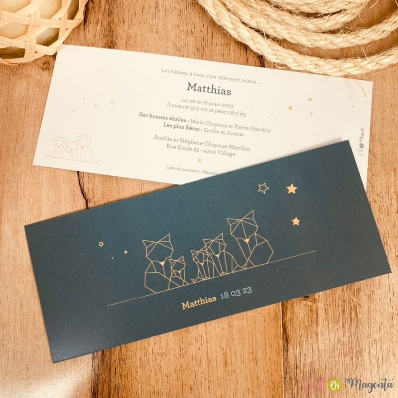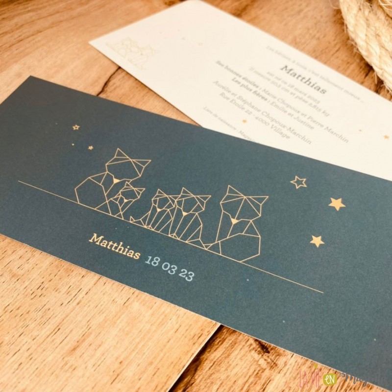 Nous avons plusieurs faire-part dans ce thème, où la famille est illustrée au moyen de petits animaux, voici notre version avec les renards en origami