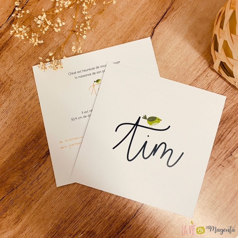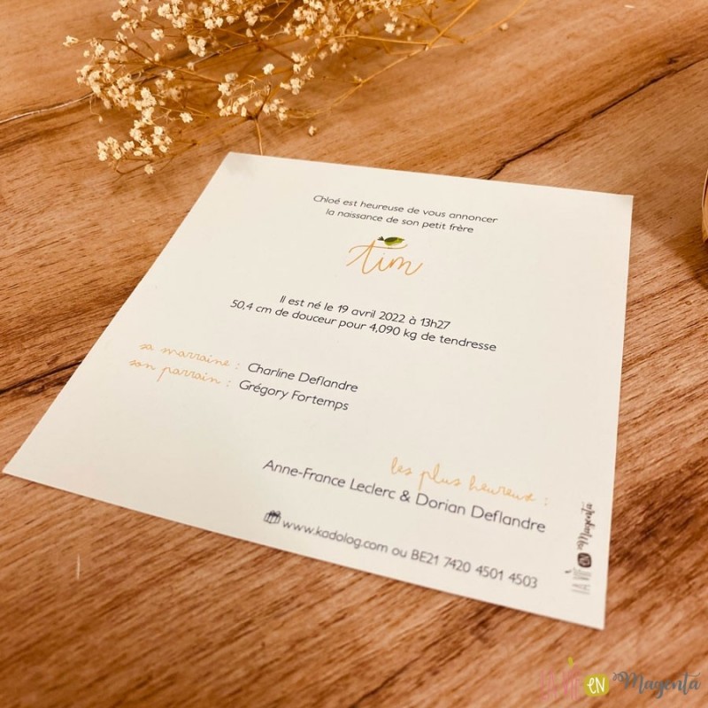 Vous recherchez un faire-part de naissance pour annoncer la naissance de votre enfant ? Ce faire-part naissance 'Tim' illustrera avec beaucoup de douceur votre famille qui s'agrandit.