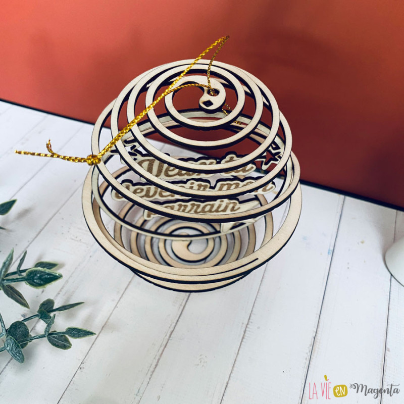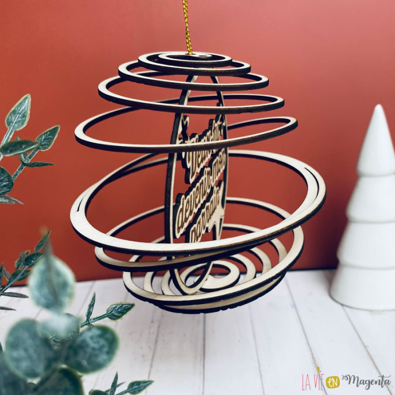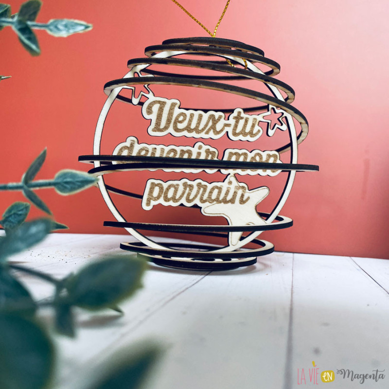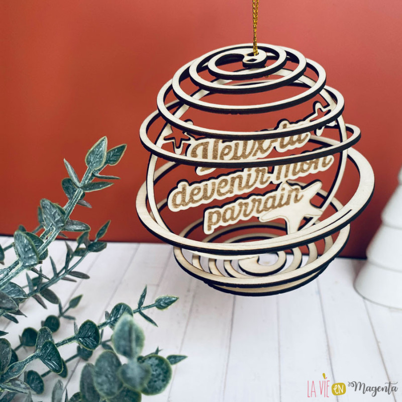 Cette boule de Noël en bois naturel est découpée au laser avec un design spirale ajouré et gravée du texte “Veux-tu devenir mon parrain ?”. Elle combine originalité, artisanat et émotion, et constitue une façon unique de poser la question à celui qui accompagnera votre enfant.