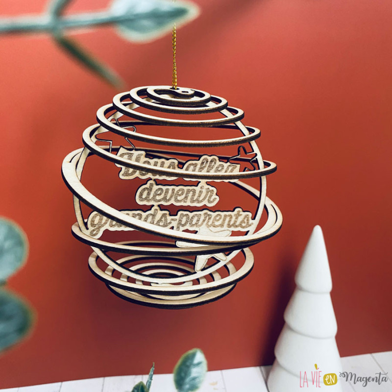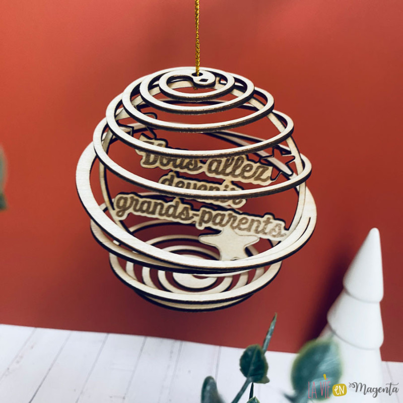 Cette boule de Noël en bois naturel est découpée au laser avec un design spirale ajouré et gravée du message “Vous allez être grands-parents”. Elle allie artisanat, émotion et originalité, et constitue une manière unique de partager cette nouvelle magique lors des fêtes de fin d’année.