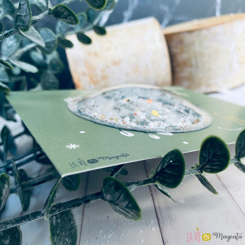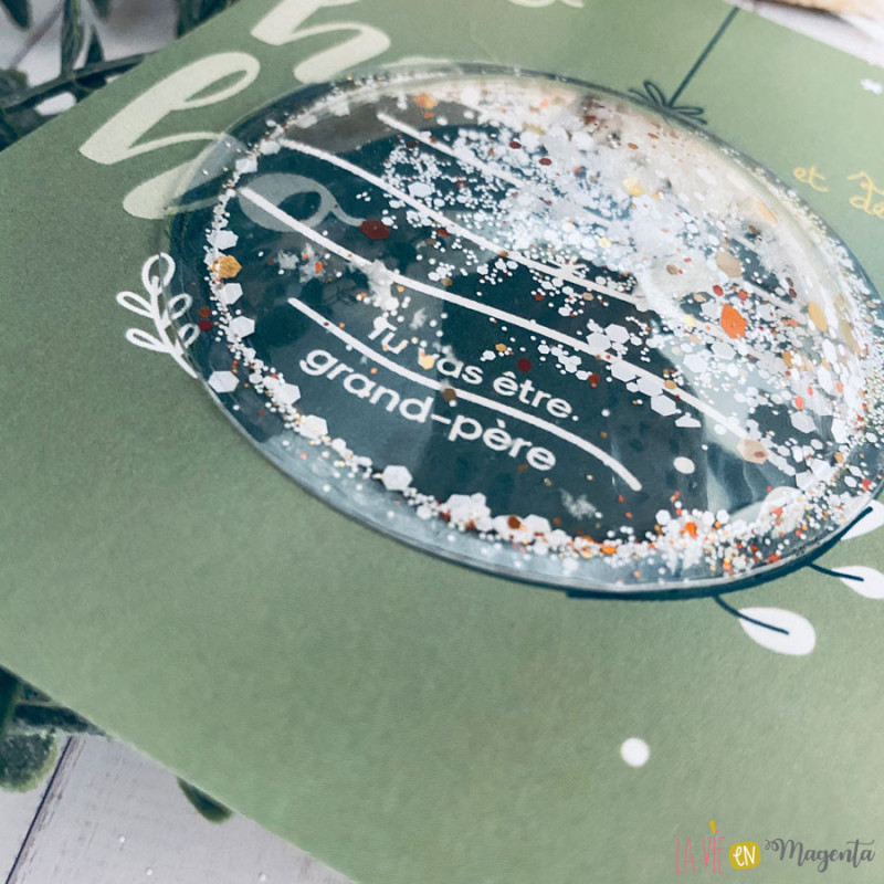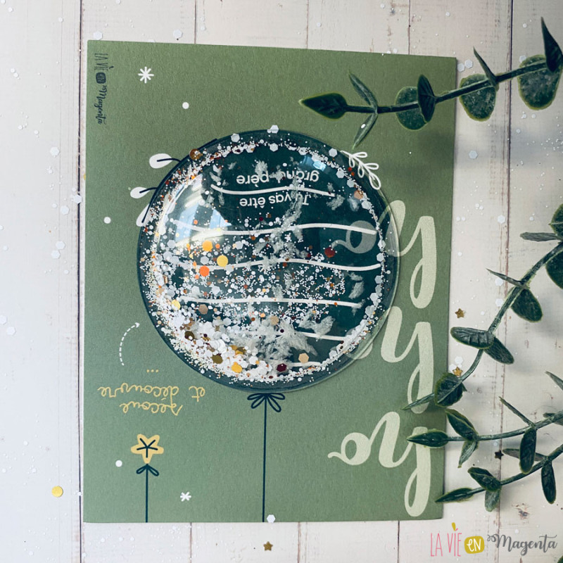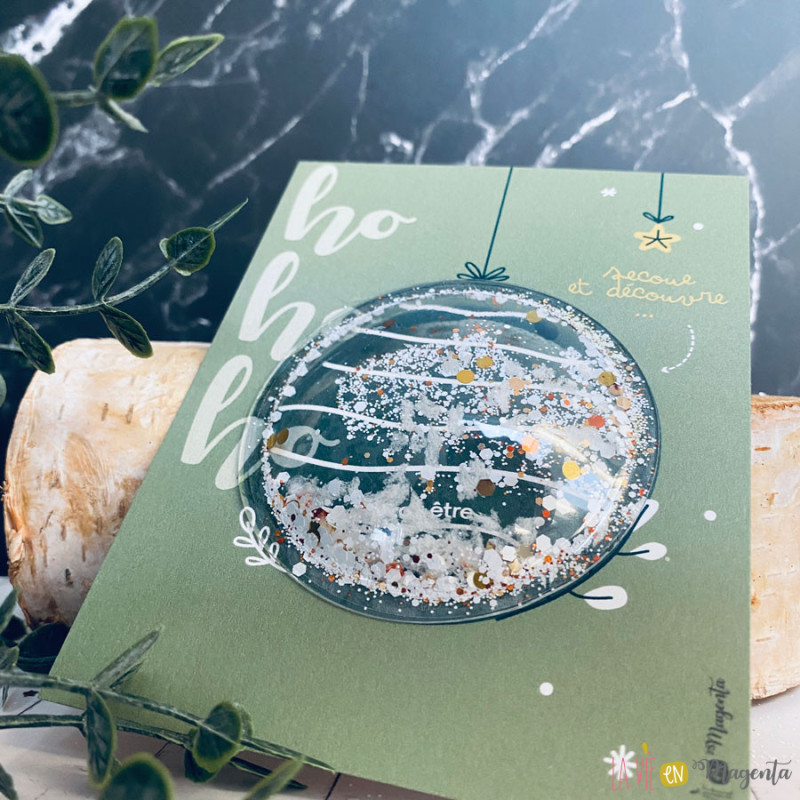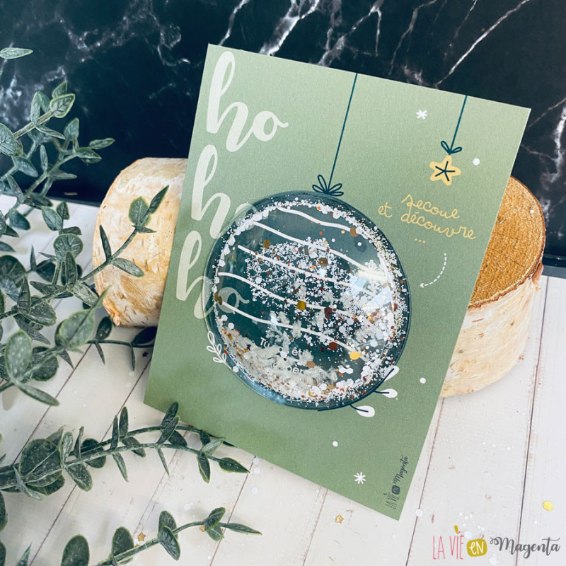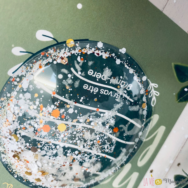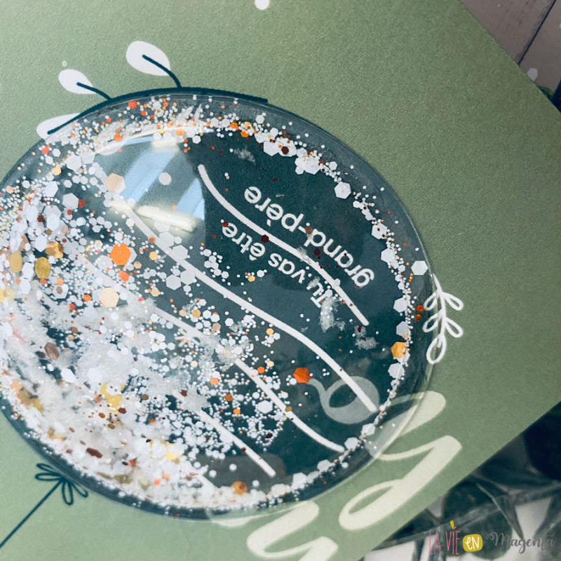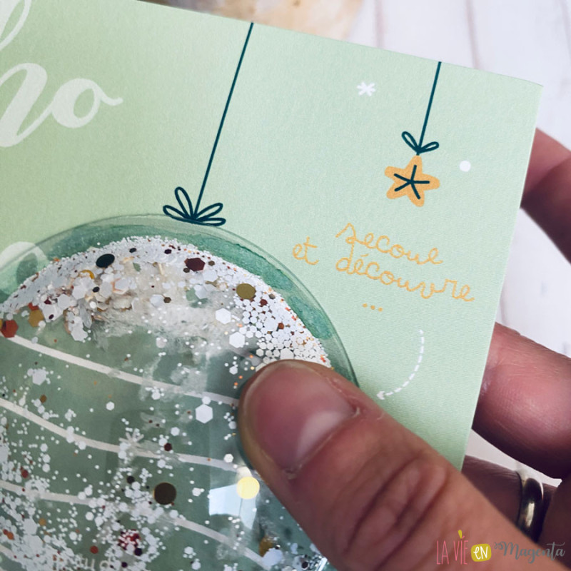 Cette carte surprise est dotée d’un dôme transparent en relief, rempli de paillettes mobiles. Le message est volontairement dissimulé pour créer un effet waouh à la découverte. Un joli souvenir à conserver, bien au-delà de la demande.