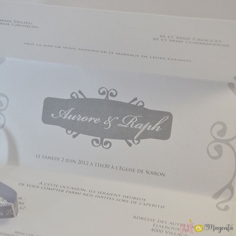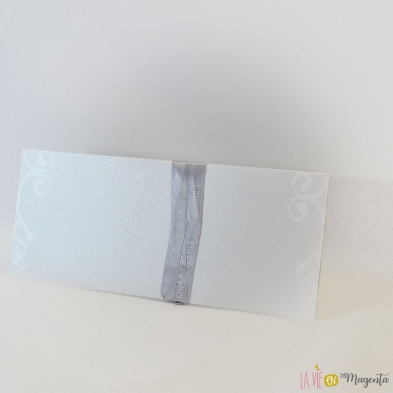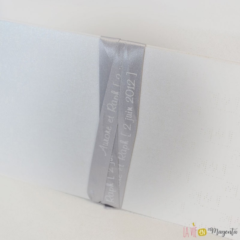 Ce faire-part mariage, imprimé sur un papier nacré, vous propose d'inscrire votre texte personnalisé sur le ruban, une manière originale de personnaliser votre faire-part mariage !